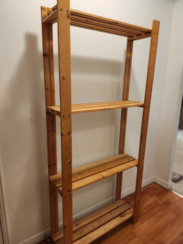 Selling a wooden shelving unit. It's in great shape and ready to add some storage to your space. It has four shelves and is made of a light-coloured wood. It would be perfect for books, plants, or anything else you need to organize