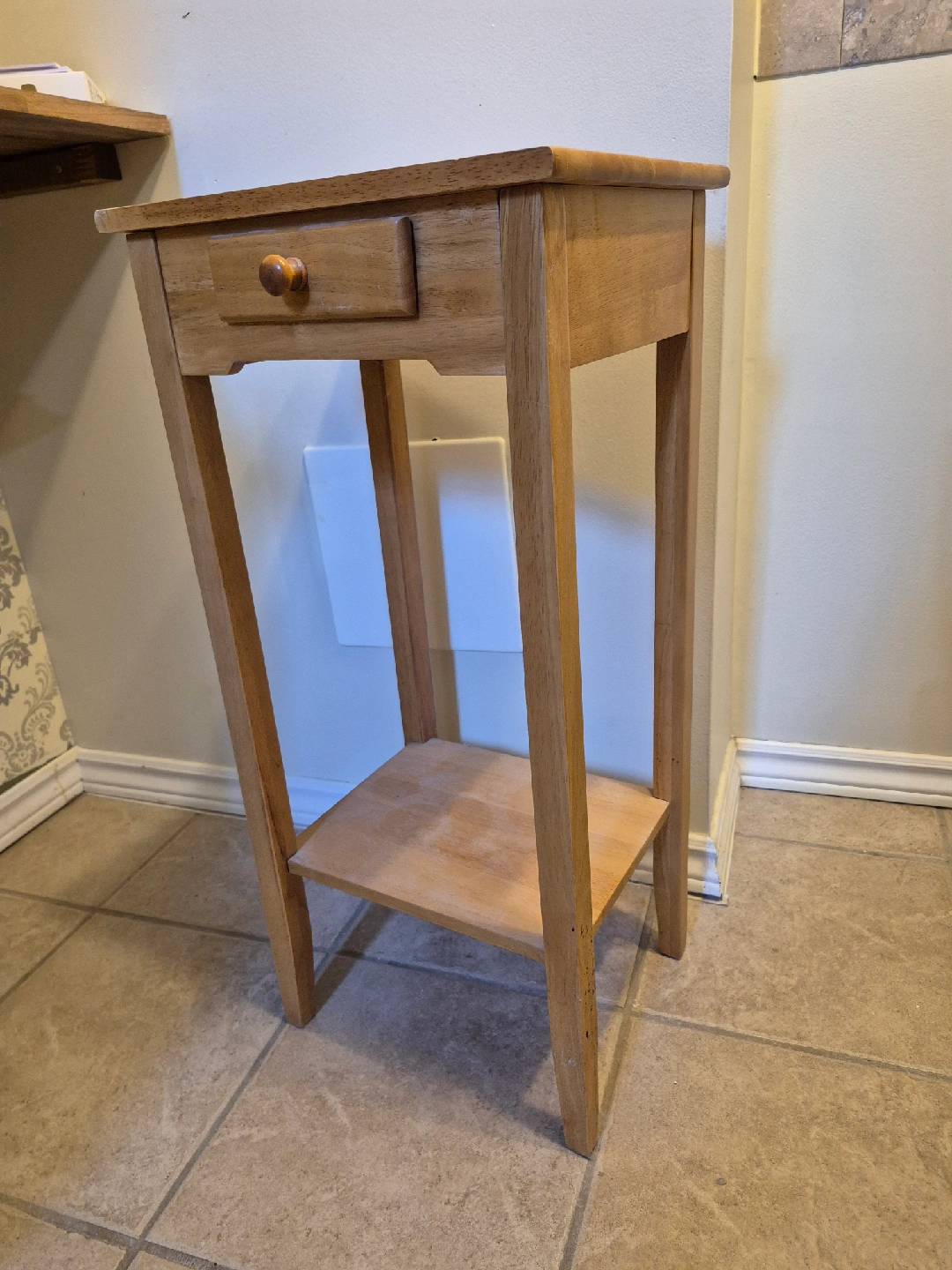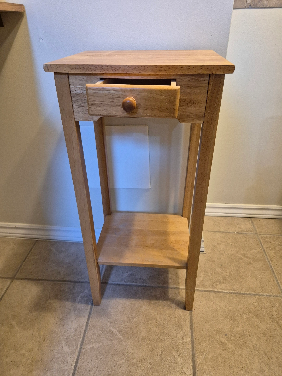 This is a cute little wooden side table, perfect for a small space! It features a handy drawer and a shelf at the bottom for extra storage. It's in good condition and ready for a new home!