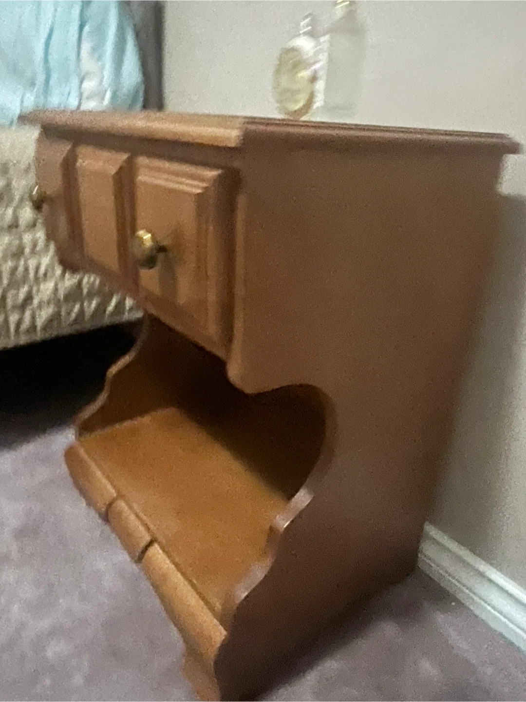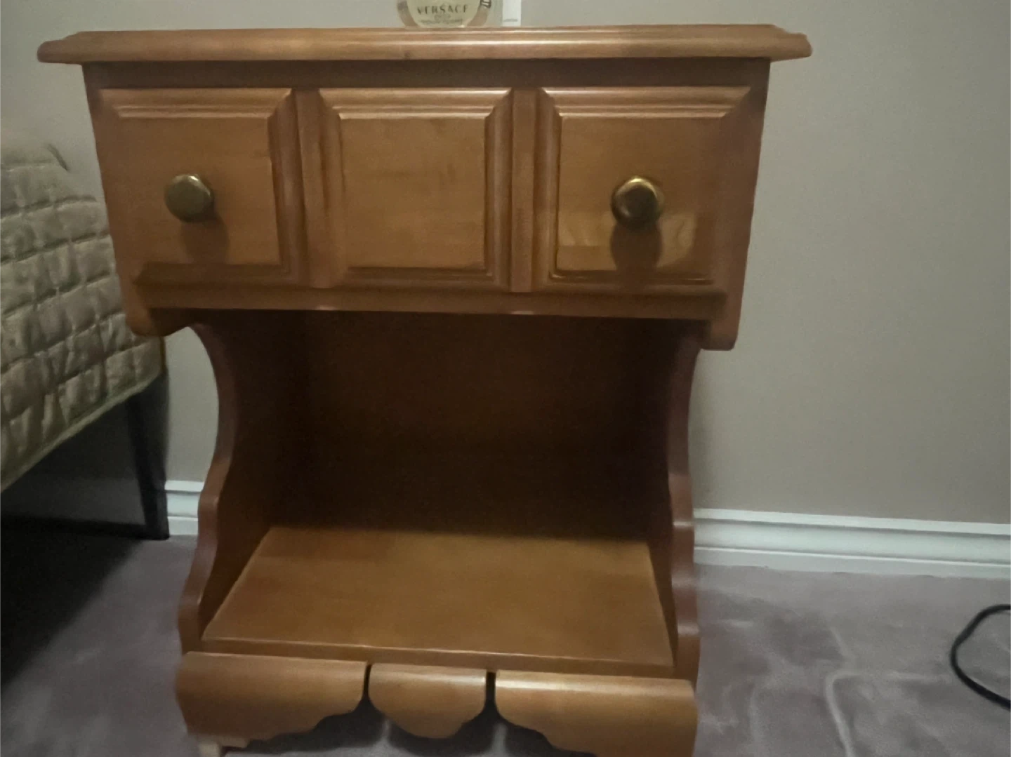 Selling a cute wooden side table! It has a drawer for storage and an open shelf at the bottom. It's perfect for a bedside table or as an accent piece in your living room. In good condition and ready for a new home!
