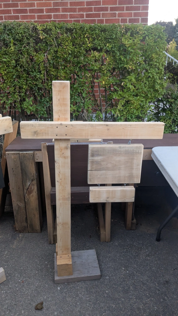 Selling a wooden sign holder! It appears to be in good condition and is made of wood. Perfect for displaying signs for your business or he number for ur home/cottage. ask for measurements