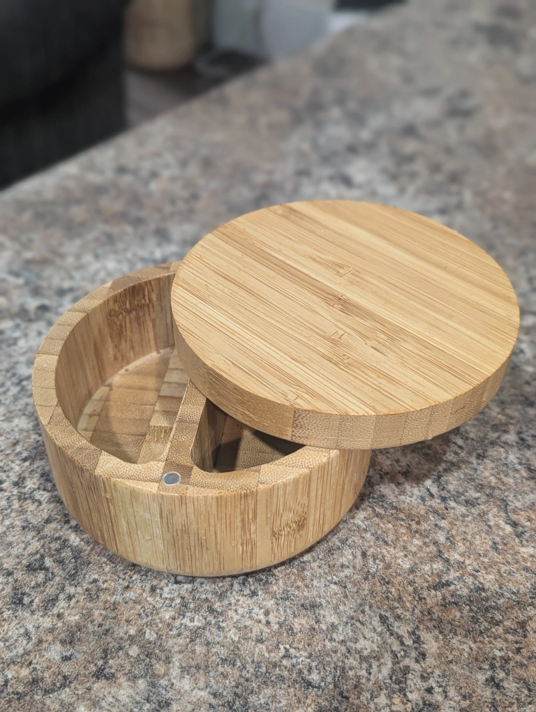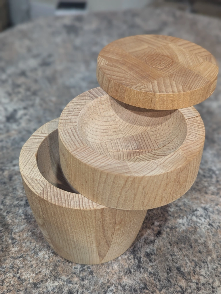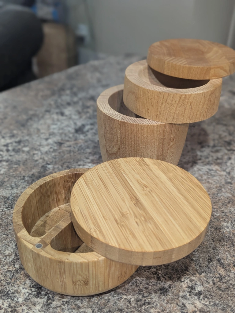 Wooden spice containers. They're made of natural wood and have a clean, simple design. Great for organizing spices. Tall one has a crack $5 each