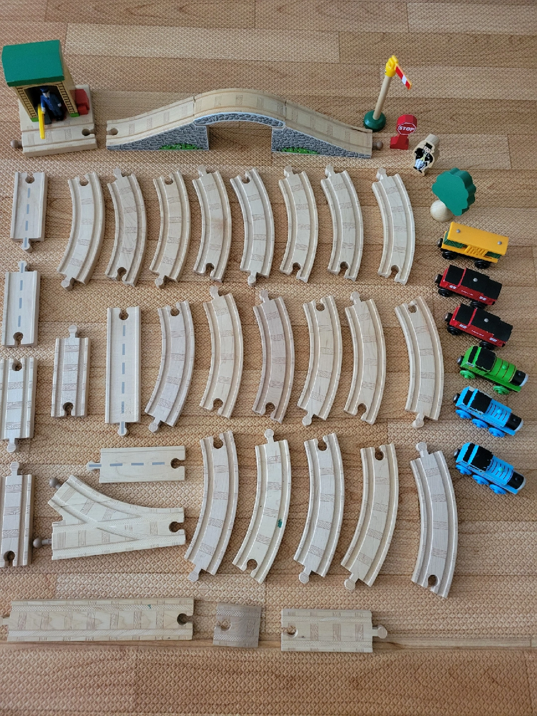 Selling a complete wooden train set! Includes lots of tracks, a bridge, several trains, and other fun accessories for hours of creative play