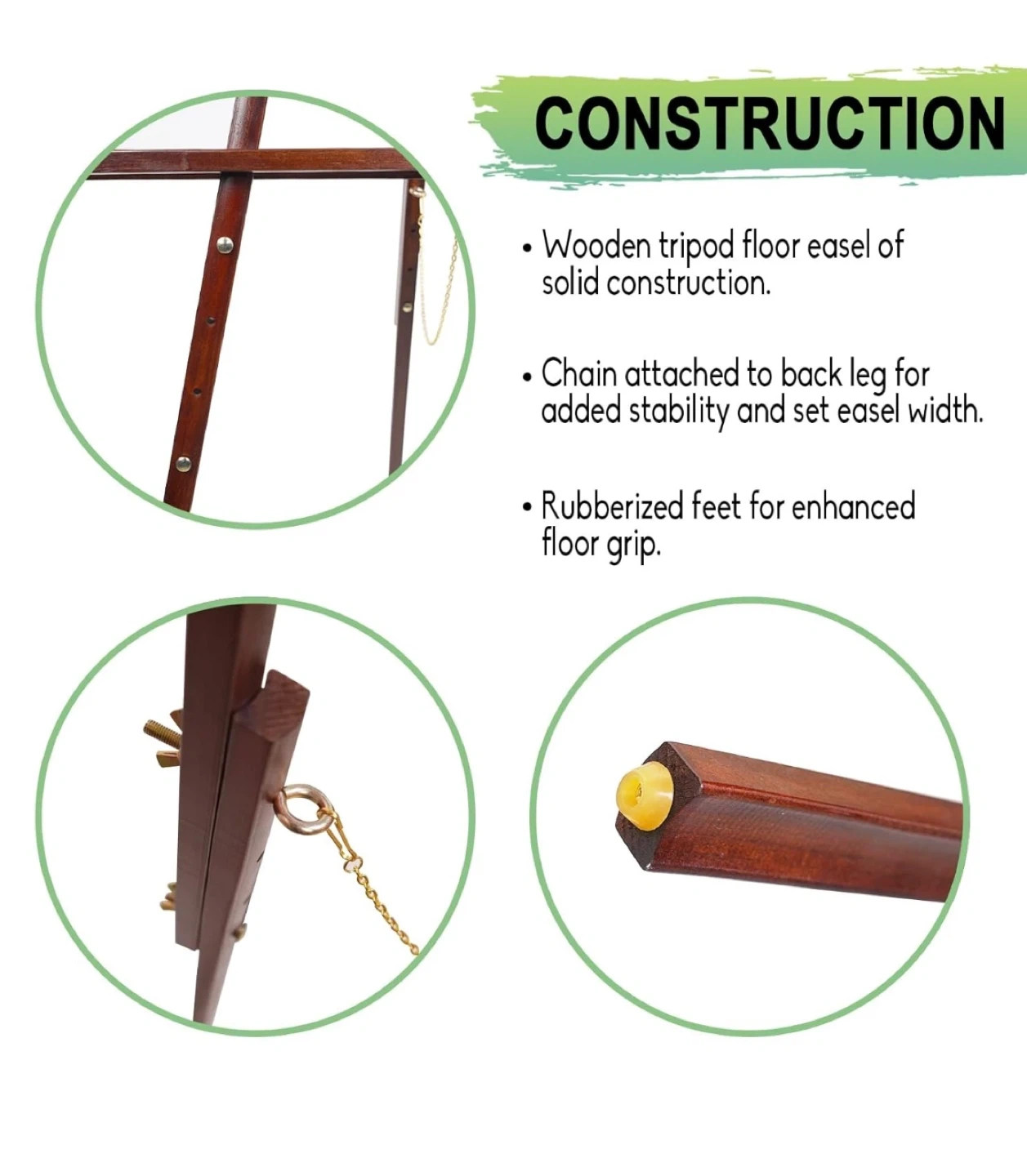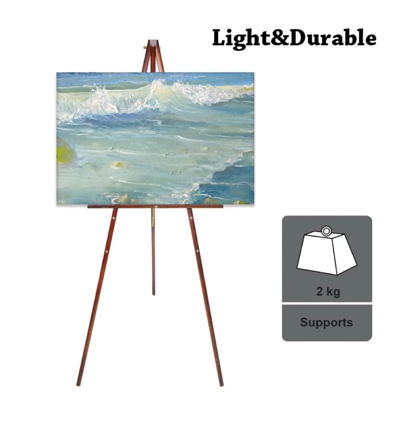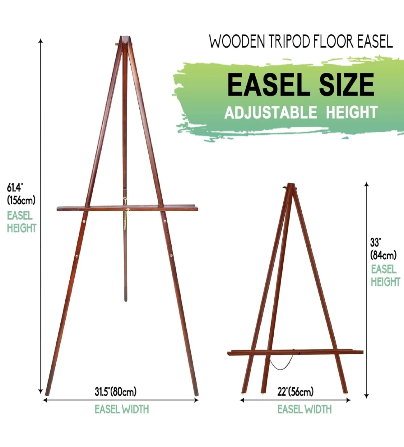 This is a wooden tripod floor easel with an adjustable height. It's a solid construction with a chain attached to the back leg for added stability and to set the easel width. It also has rubberized feet for enhanced floor grip. The easel is light and durable and supports up to 2 kg. The easel height is adjustable, with a maximum height of 61.4 inches (156cm) and a minimum height of 33 inches (84cm). The easel width is 31.5 inches (80cm) at maximum height and 22 inches (56cm) at minimum height