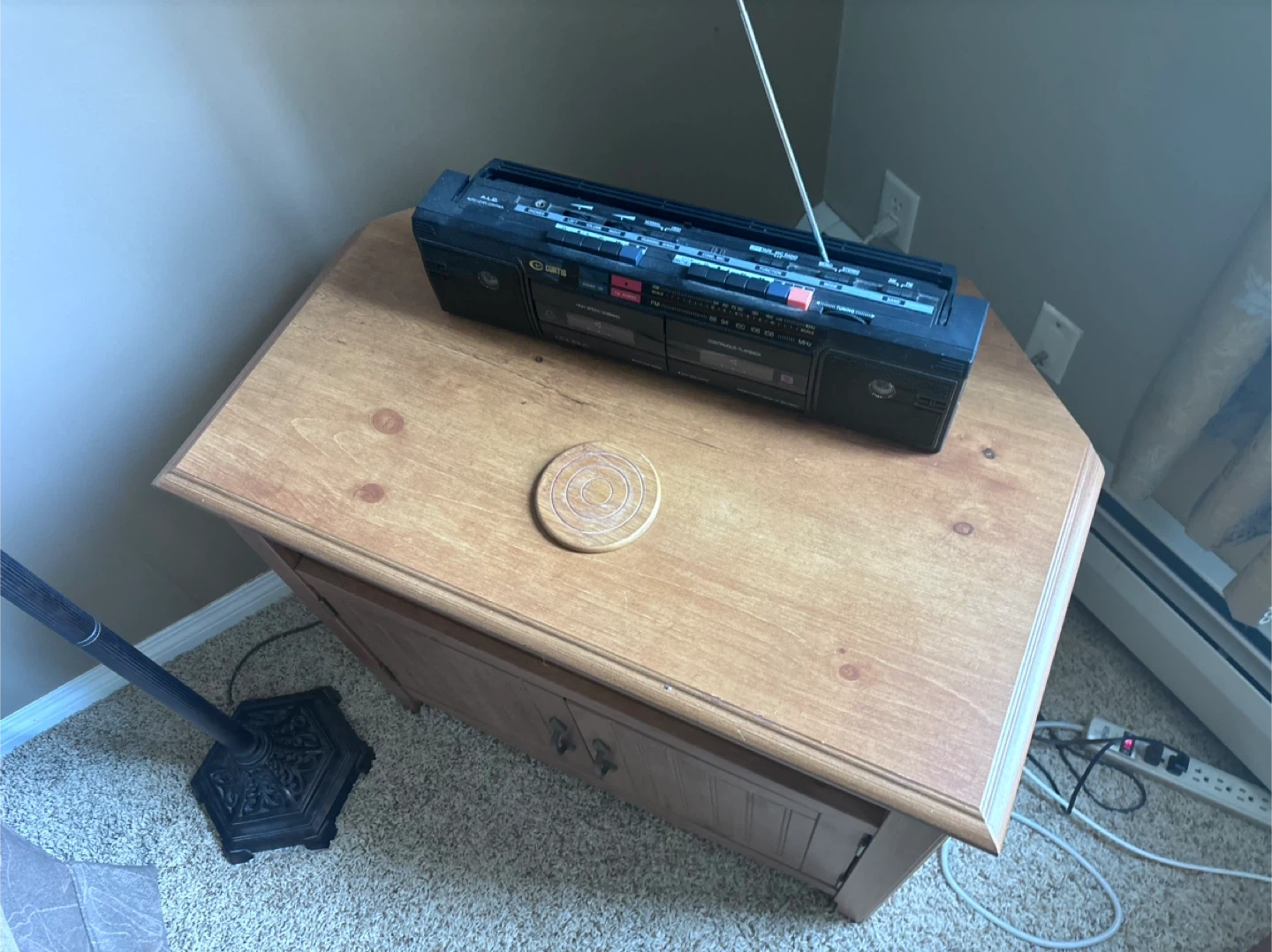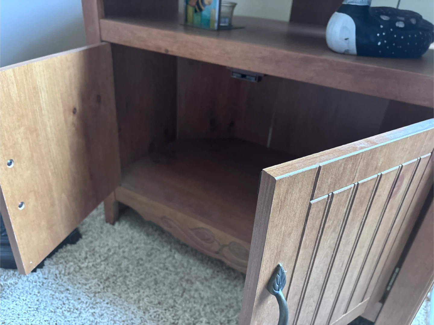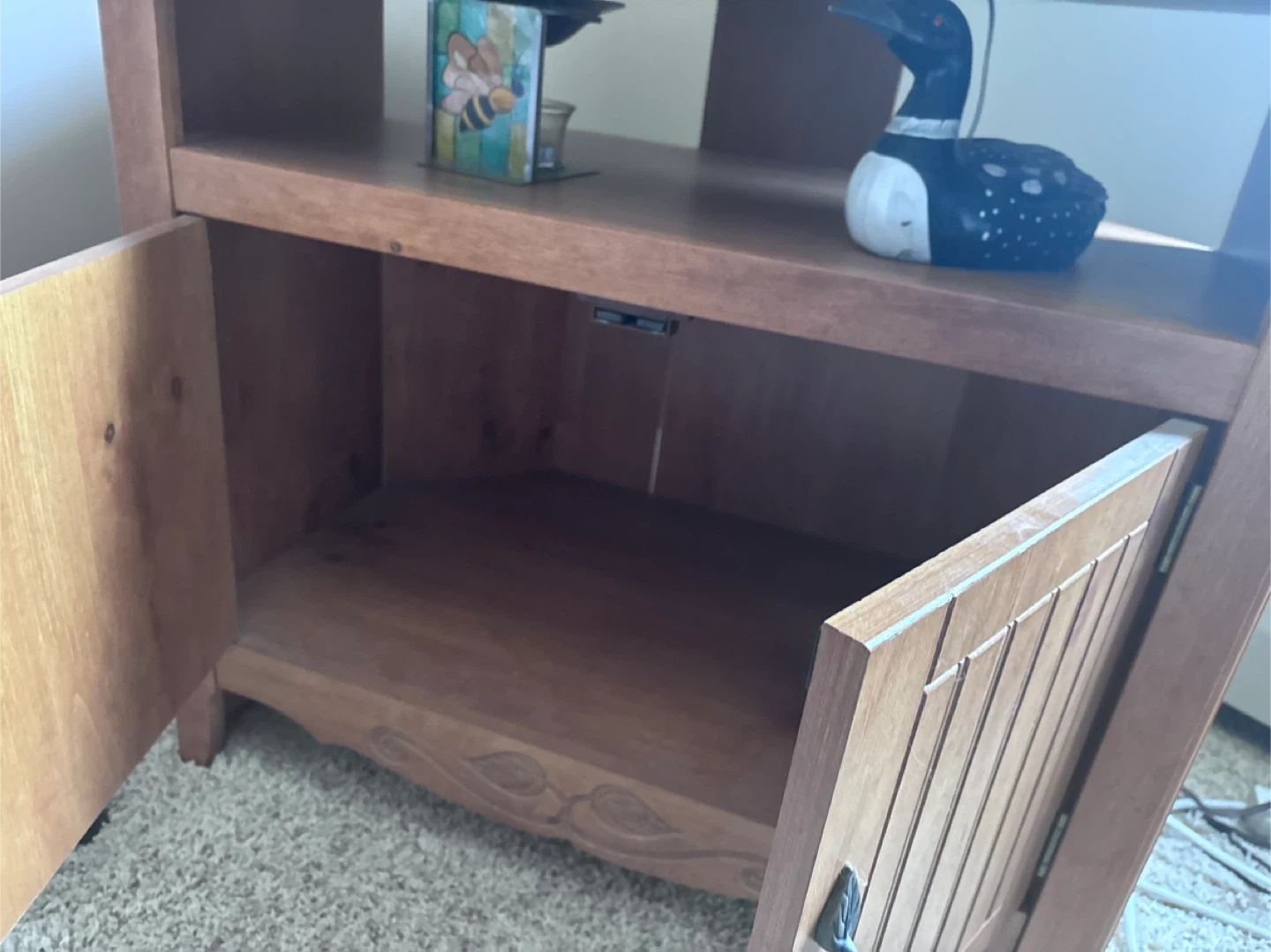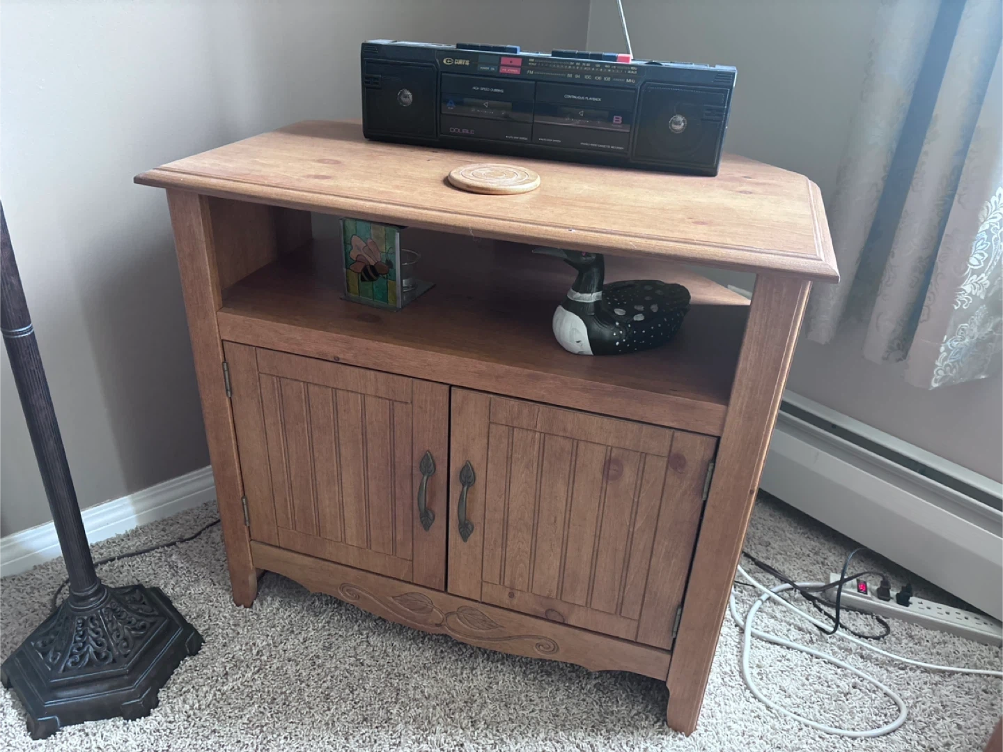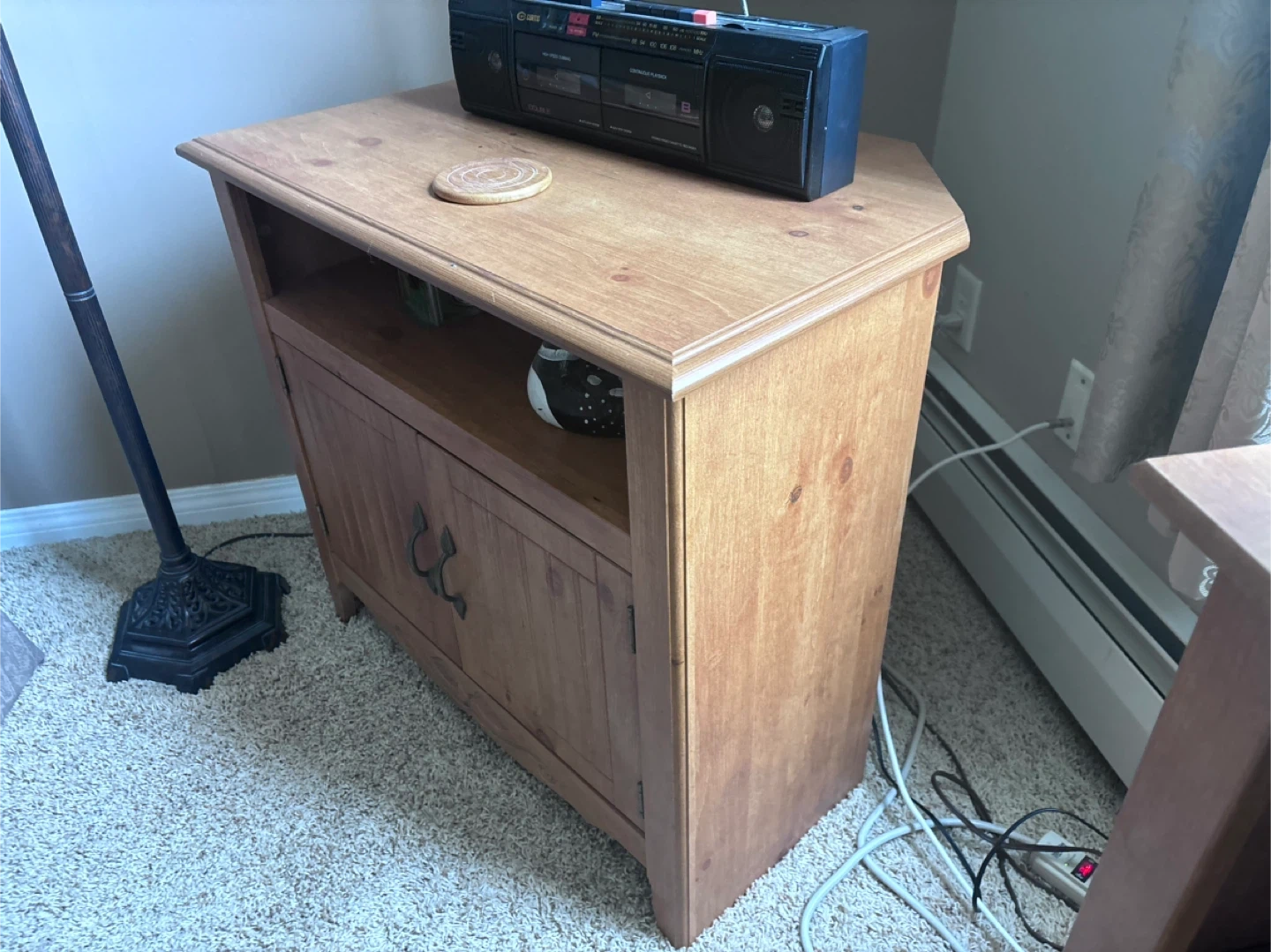 Selling a wooden TV stand with a storage cabinet! It's in great shape and perfect for adding some extra storage to your living room. The cabinet doors have a nice design, and the top is spacious enough for a TV or other items!