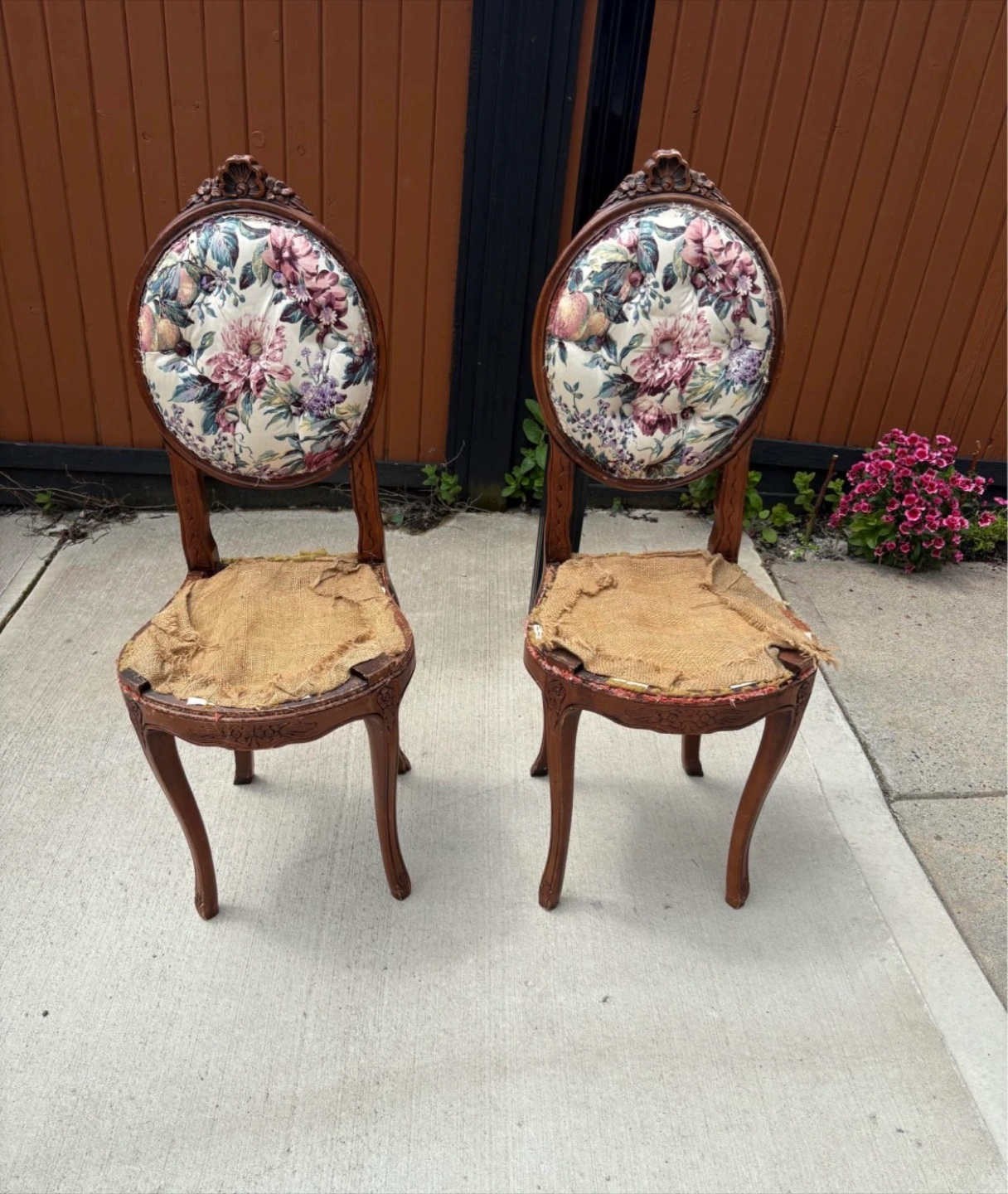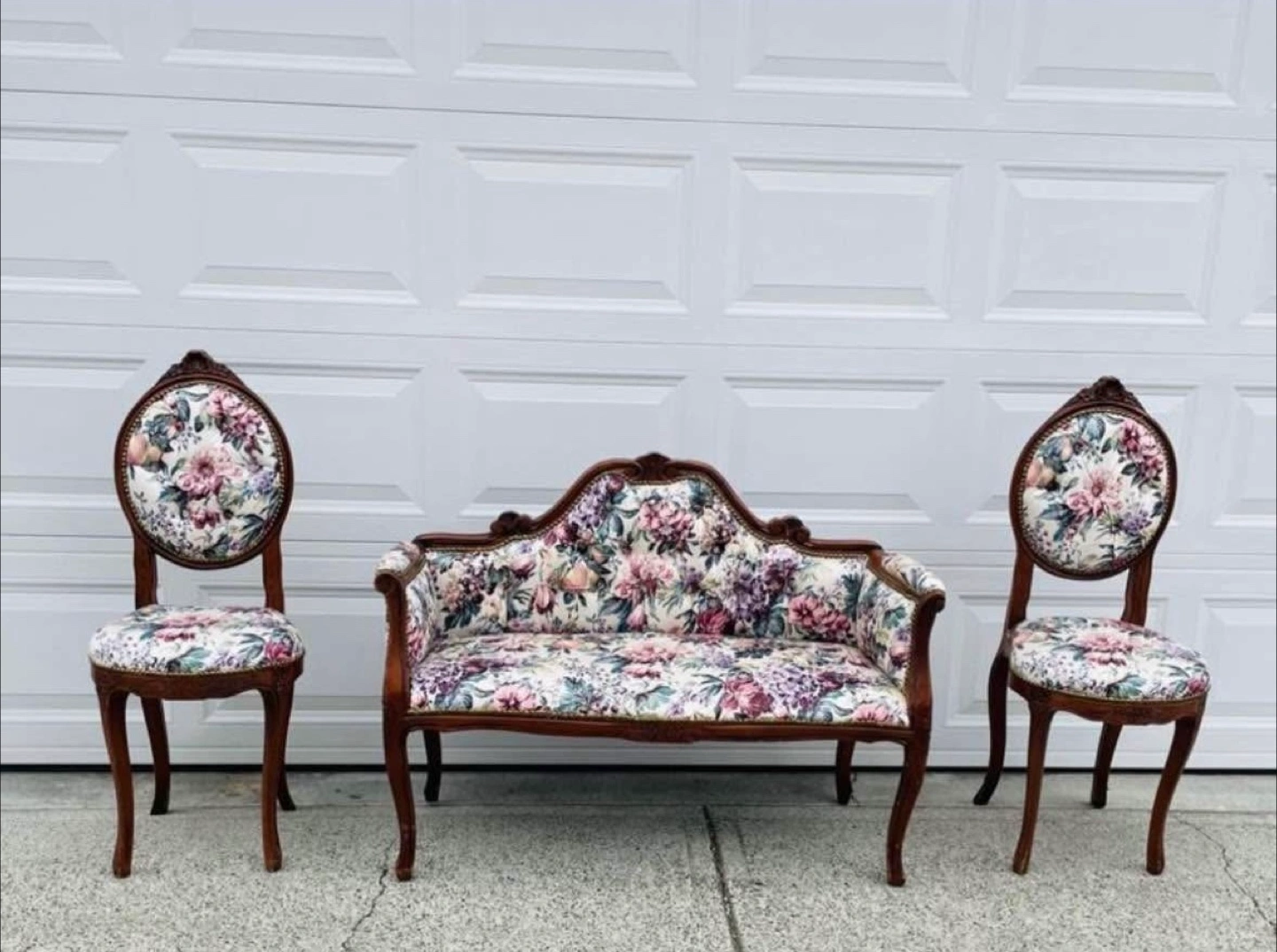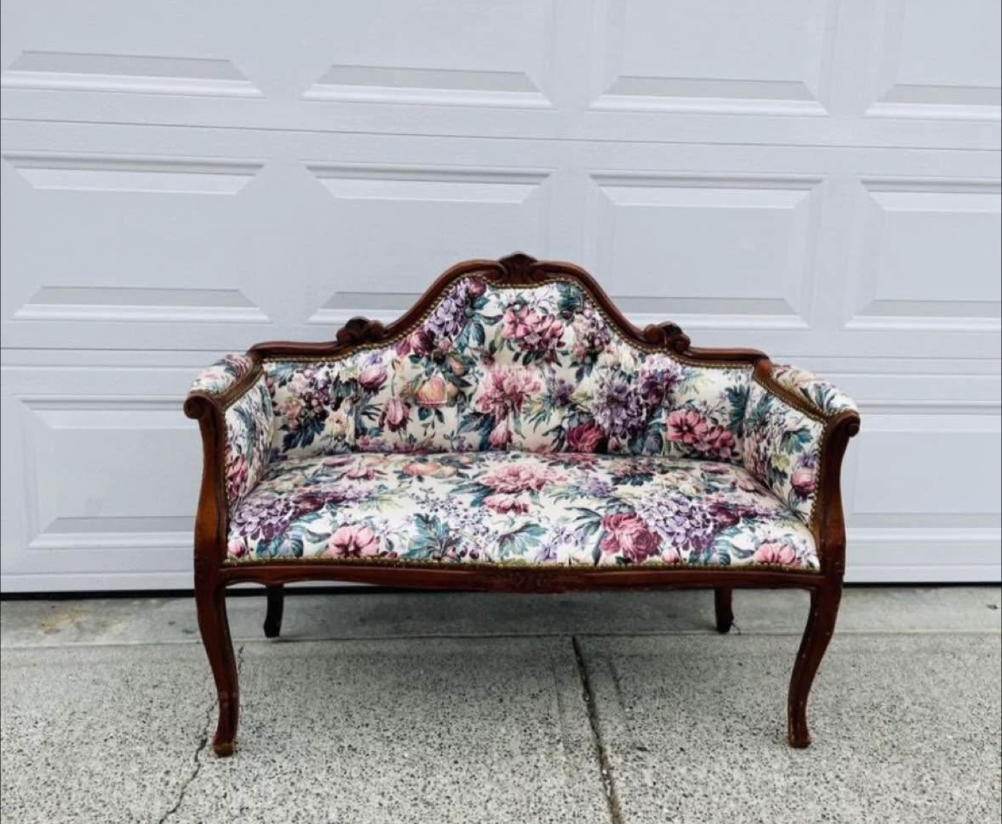 Vintage floral upholstered loveseat for sale. The chairs and loveseat have a beautiful floral pattern. Chairs are also available but I have taken seat upholstery off, meant to change it. See last picture. Settee is 41 inches wide. Pickup at 198 street on 72 Ave.