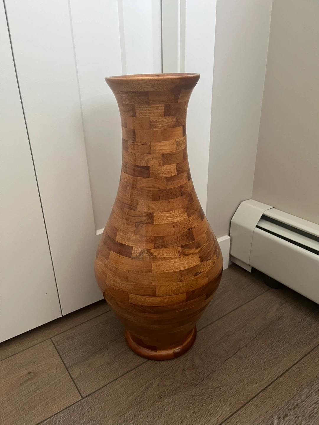 Selling a beautiful wooden vase! It has a unique mosaic-like pattern and would look lovely in any room. It's in great condition!