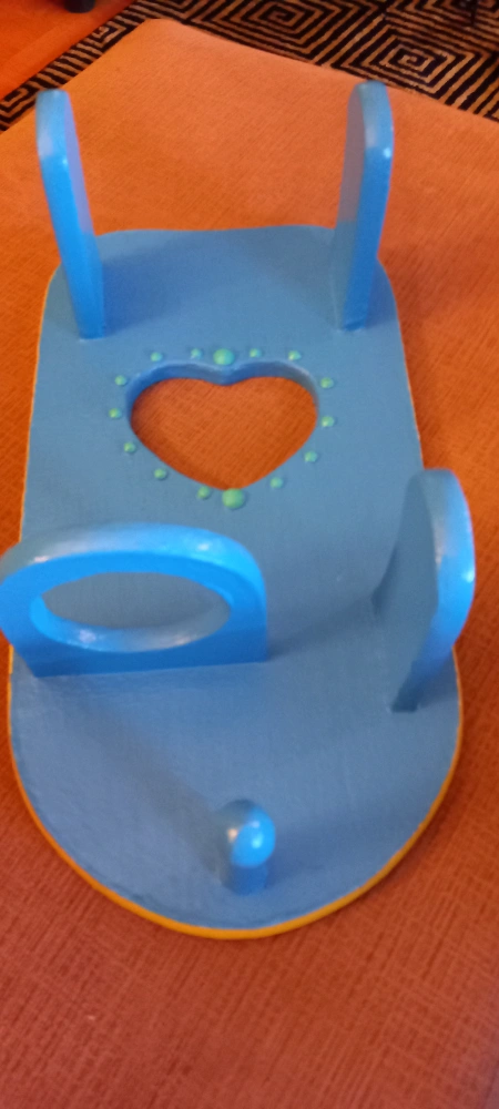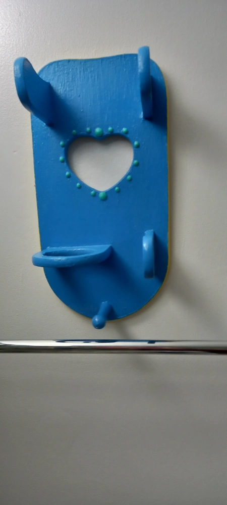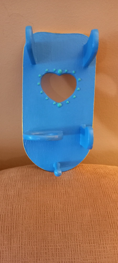 Blue and yellow painted wooden organizer with heart design. Has hook for hanging can use for blow dryer etc.