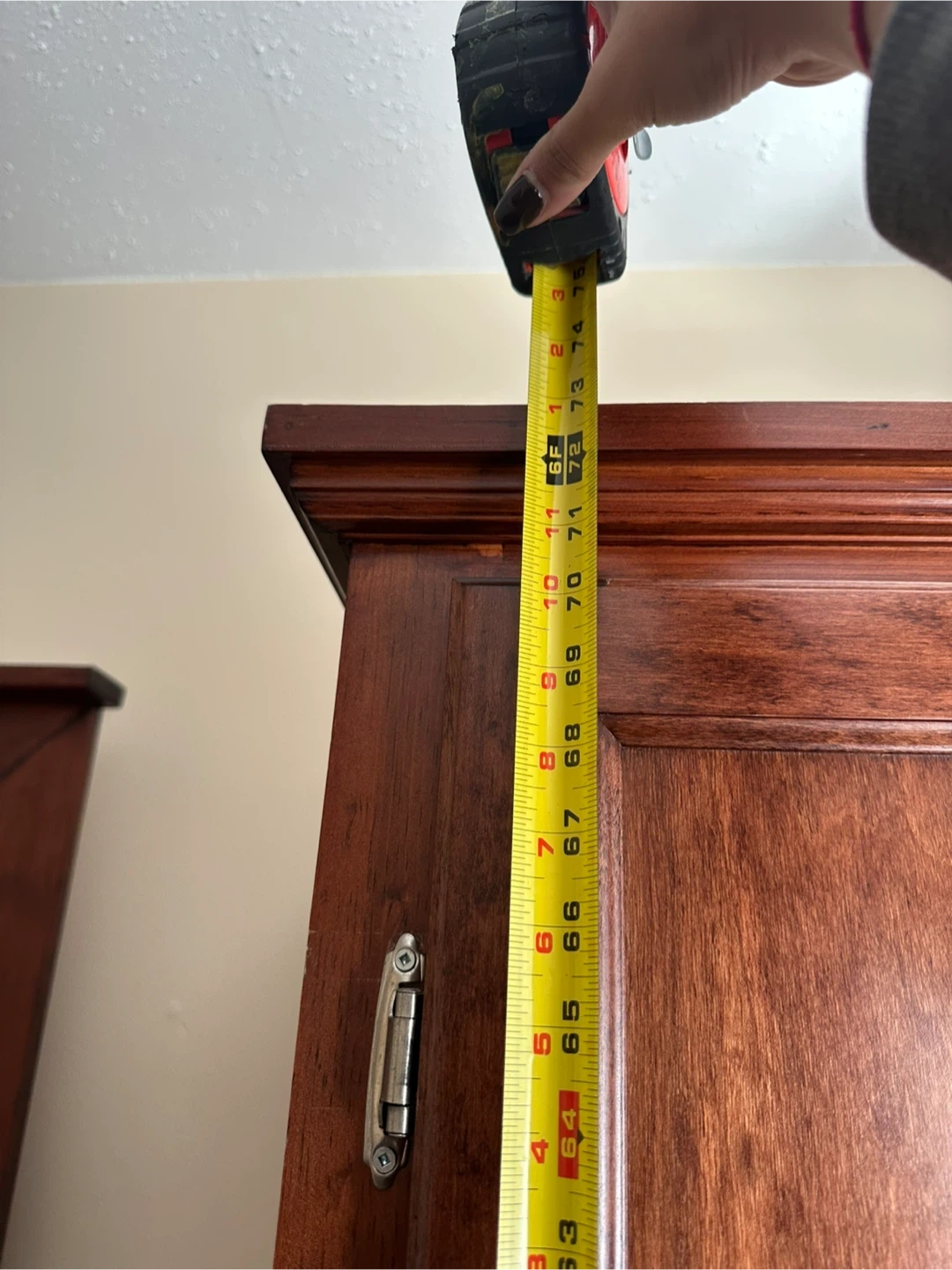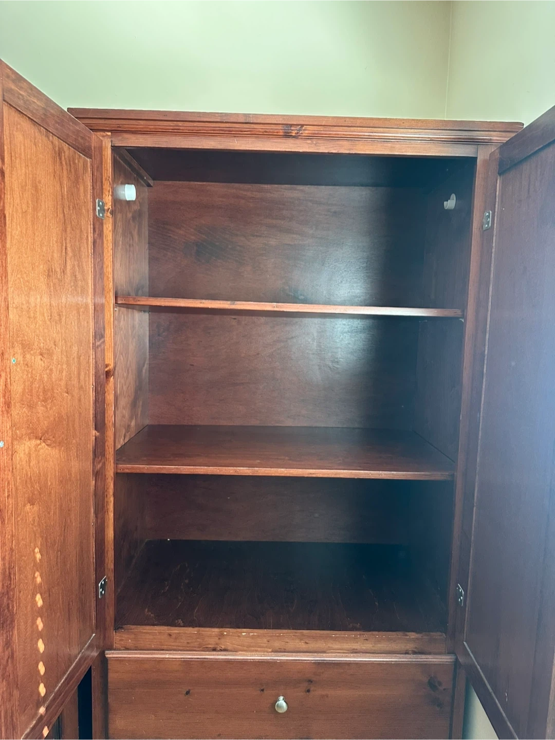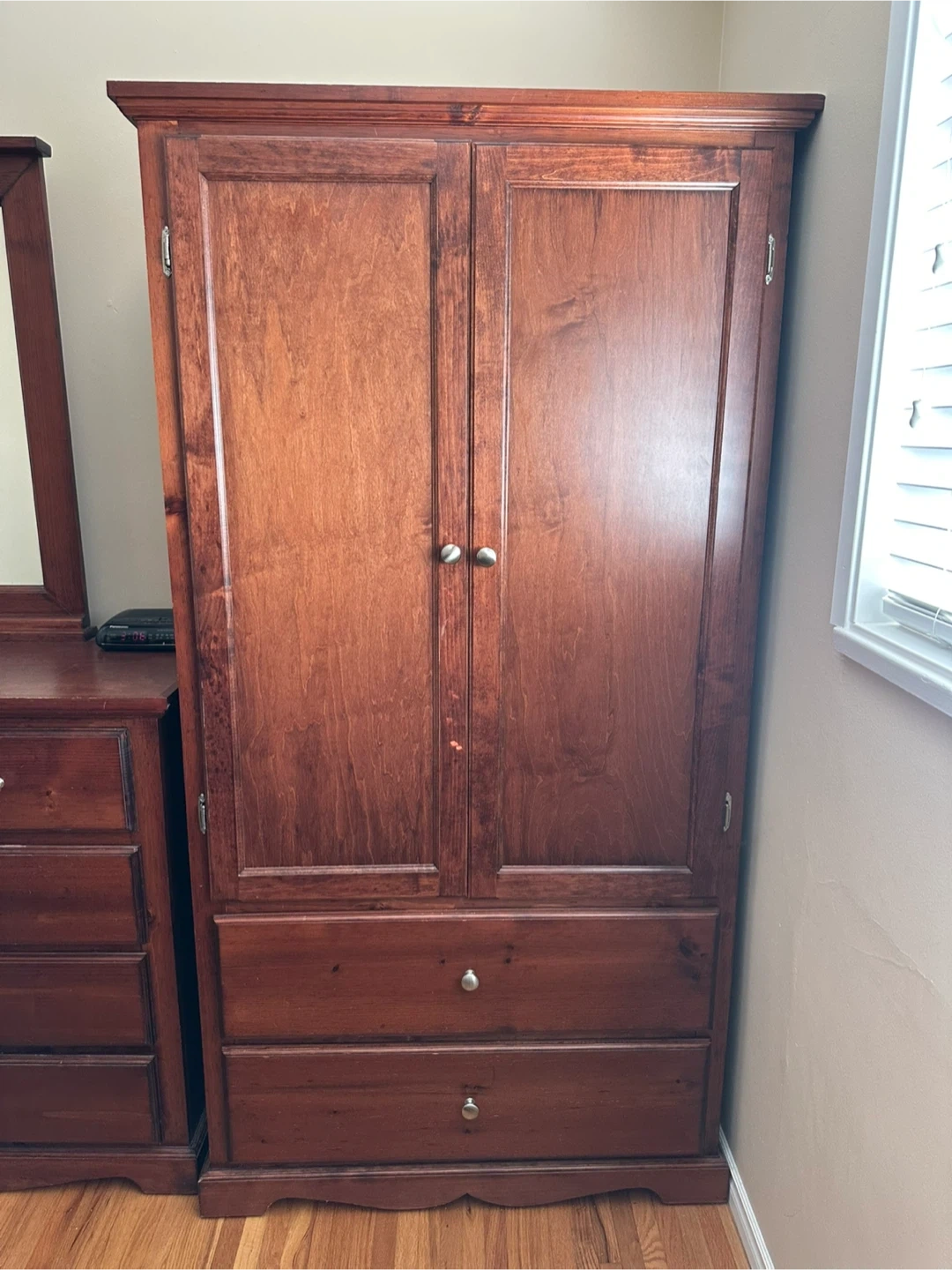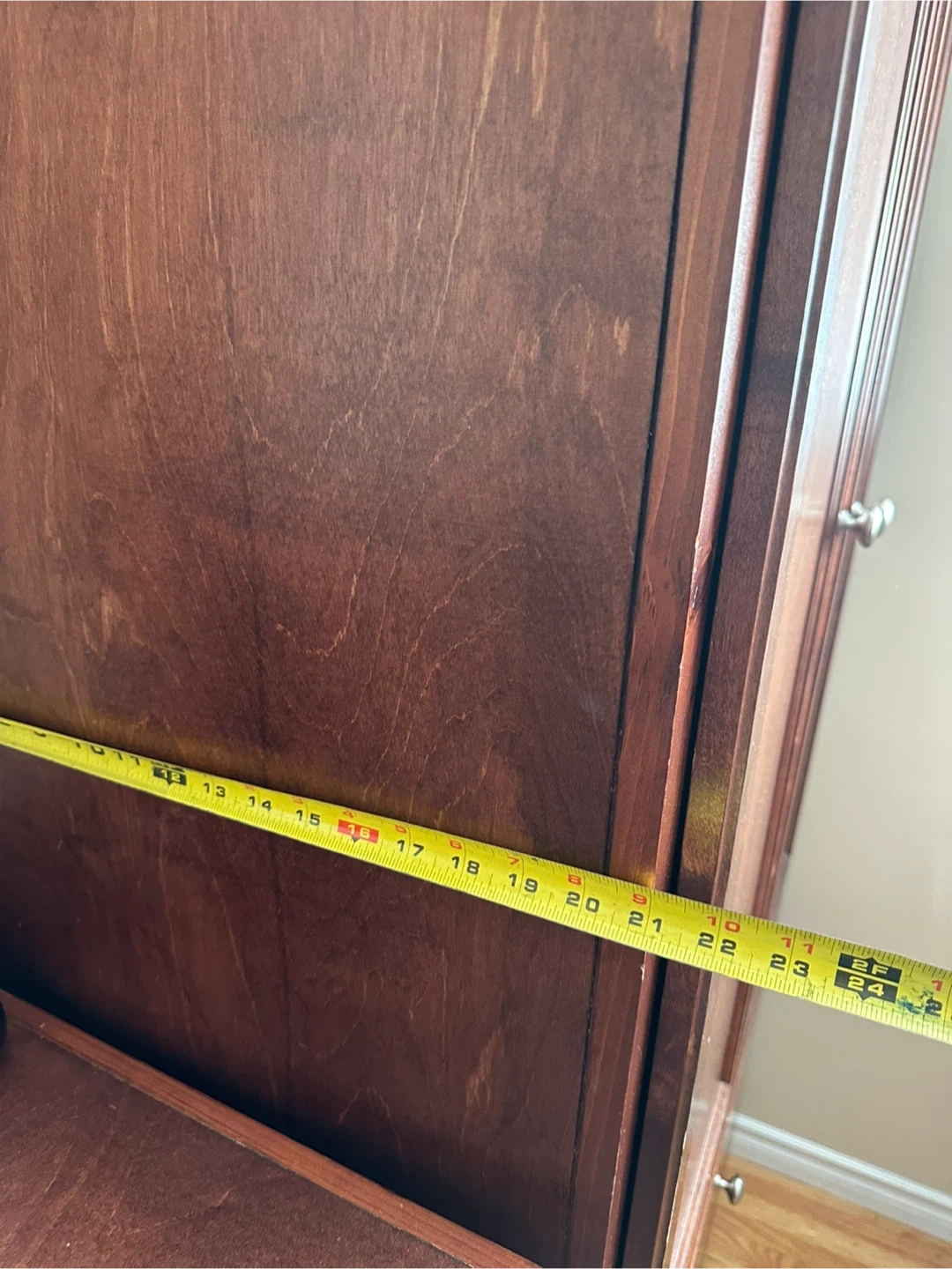 I'm selling a wooden armoire/wardrobe. It's in good condition and has plenty of storage space with shelves and drawers. It measures approximately 24 inches deep, 37 inches wide, and 73 inches tall. A great addition to any bedroom or closet!