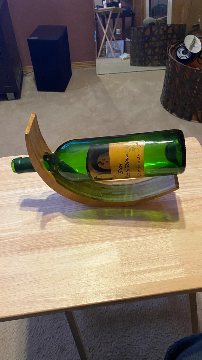 Here's a stylish wooden wine bottle holder! It's perfect for displaying your favourite bottle of wine on a countertop or table. It adds a touch of rustic charm to any room and is a great conversation starter. 🧡