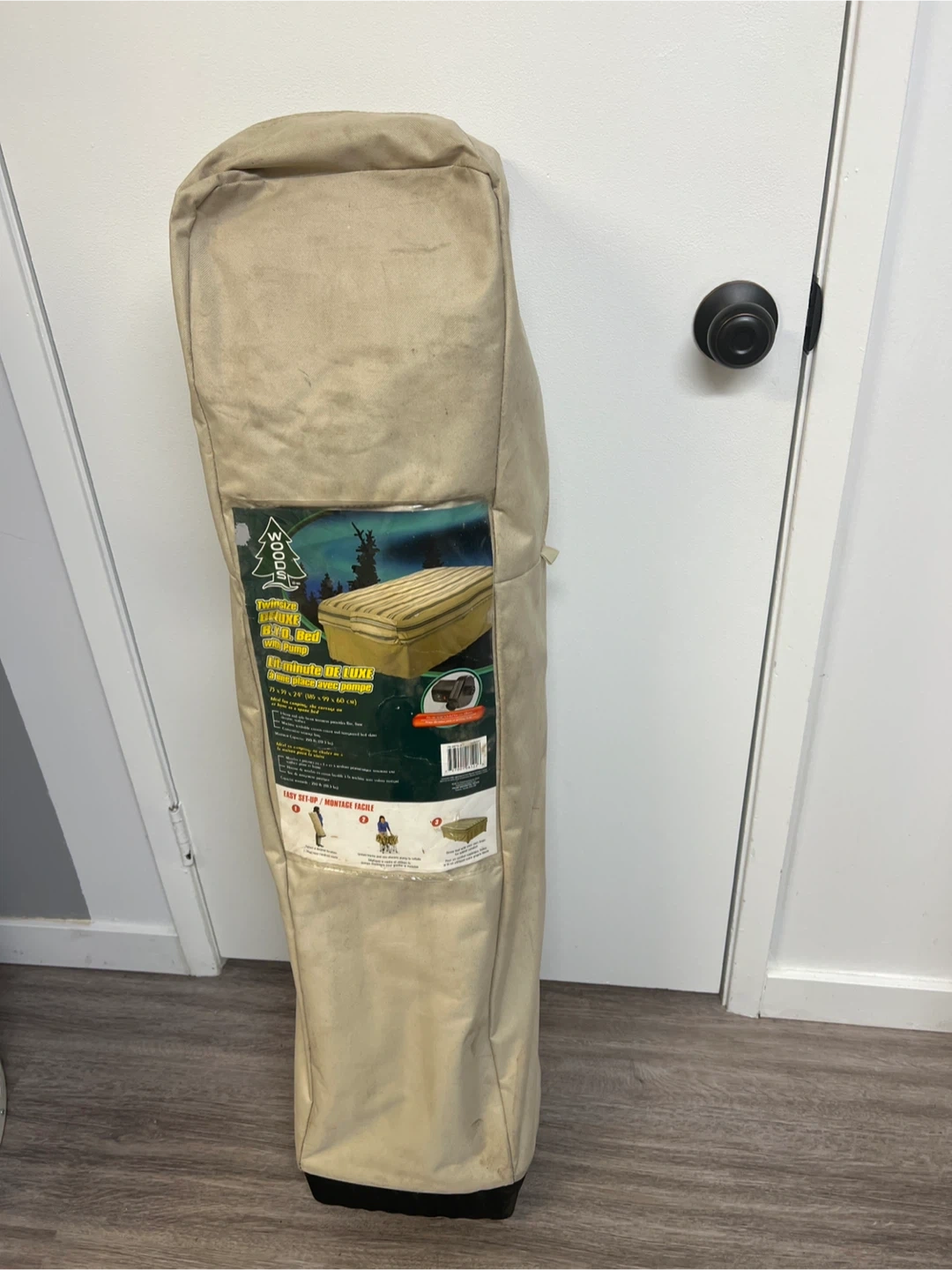 Selling a Woods Twin Size Deluxe B.Y.O. Bed with Pump! It's perfect for camping, the cottage, or as a spare bed at home. Dimensions are 73 x 39 x 24" (185 x 99 x 60 cm). It has a machine washable cotton cover and an integrated bed skirt. Easy set-up! It has never been used still in original packaging inside the duffle bag, which has a strap for easy carrying