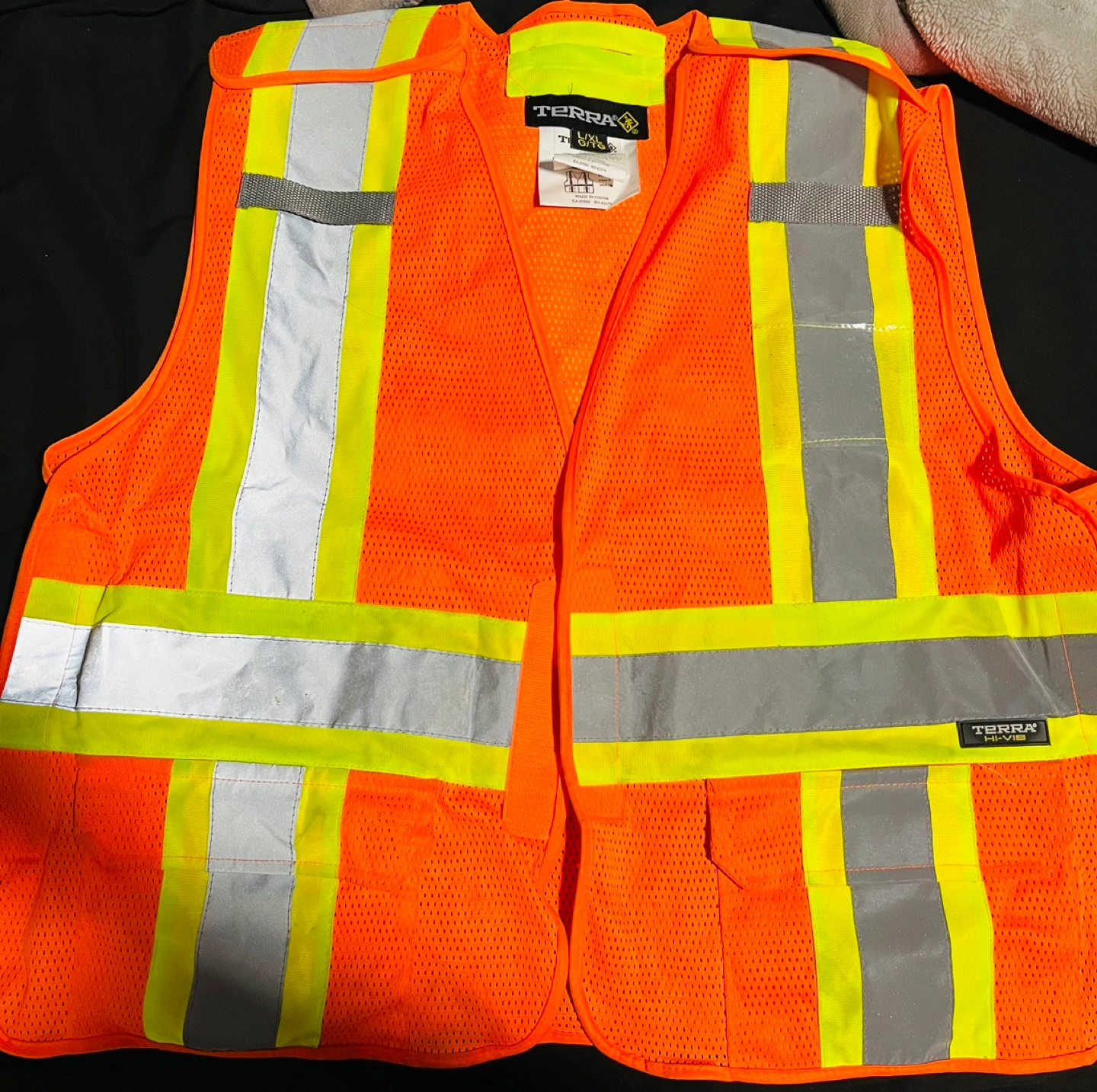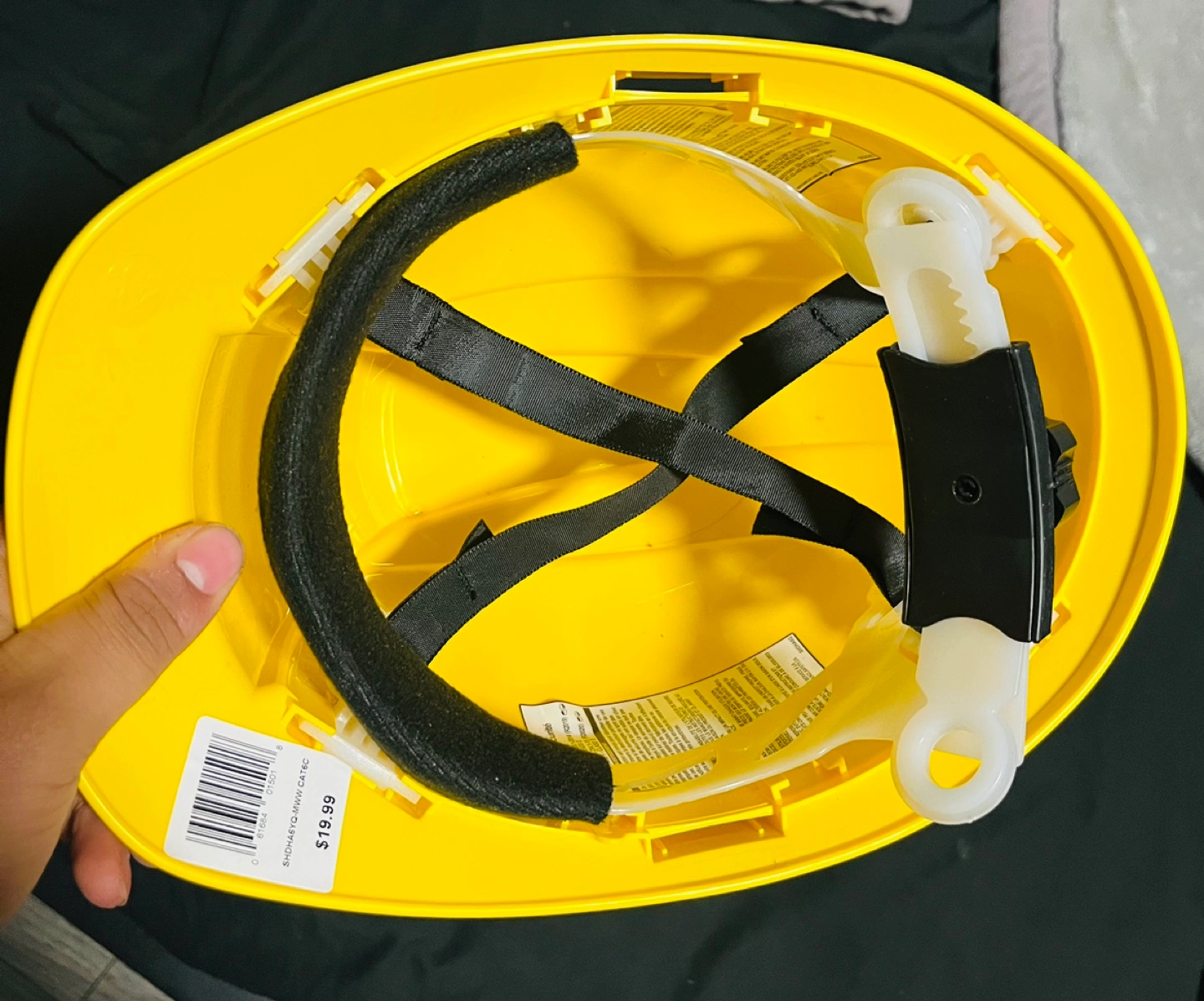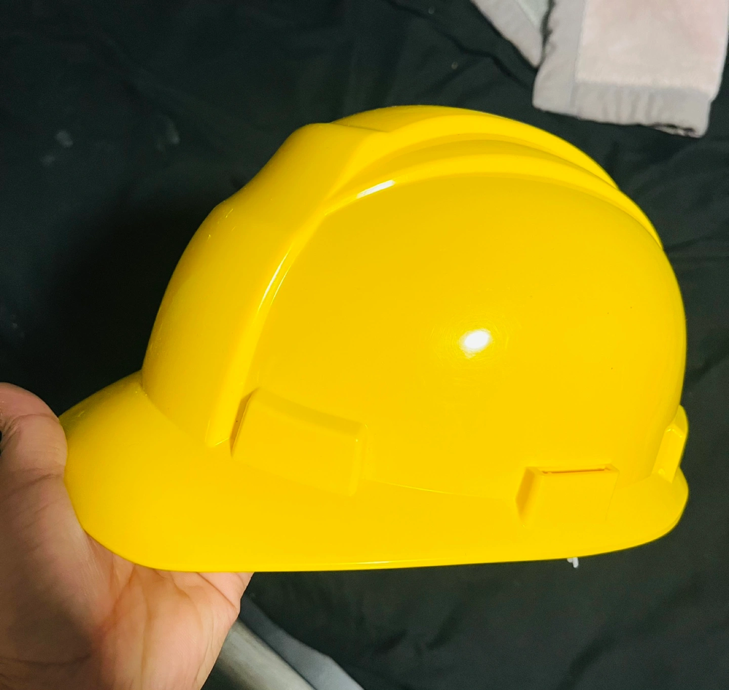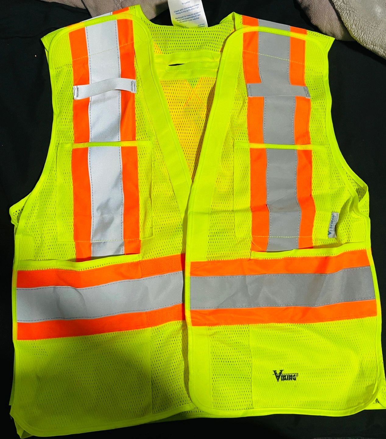 Black work boots with gray laces and a green logo. Yellow hard hat with a black suspension system. Yellow safety vest with orange and white reflective strips. Viking brand.