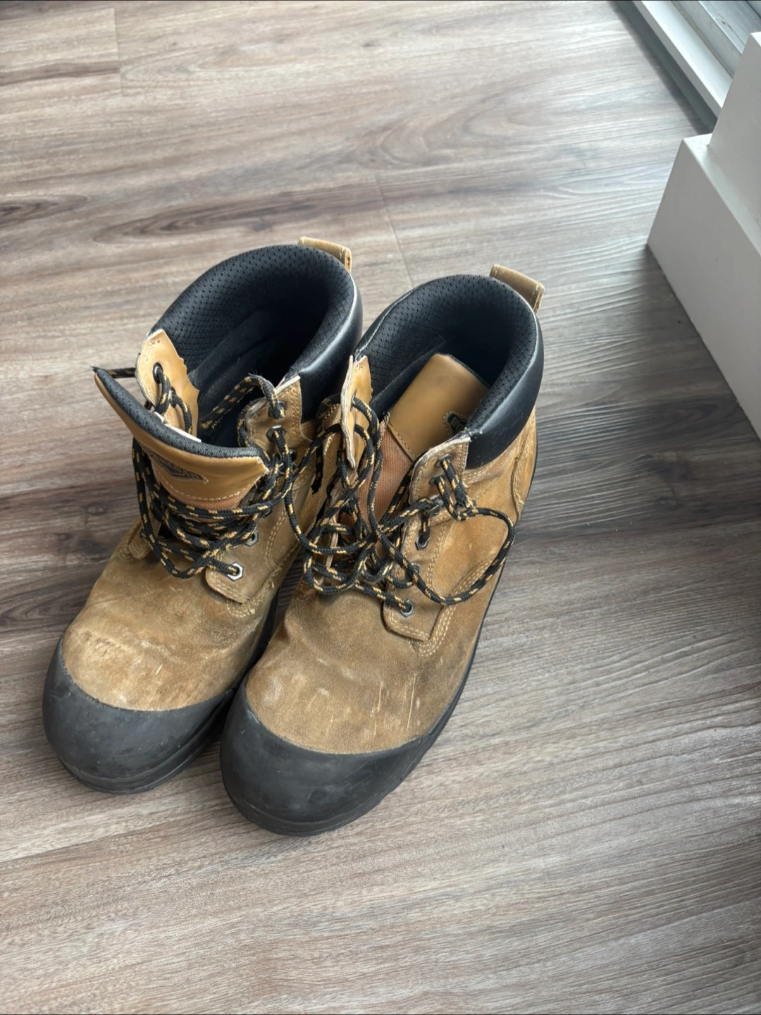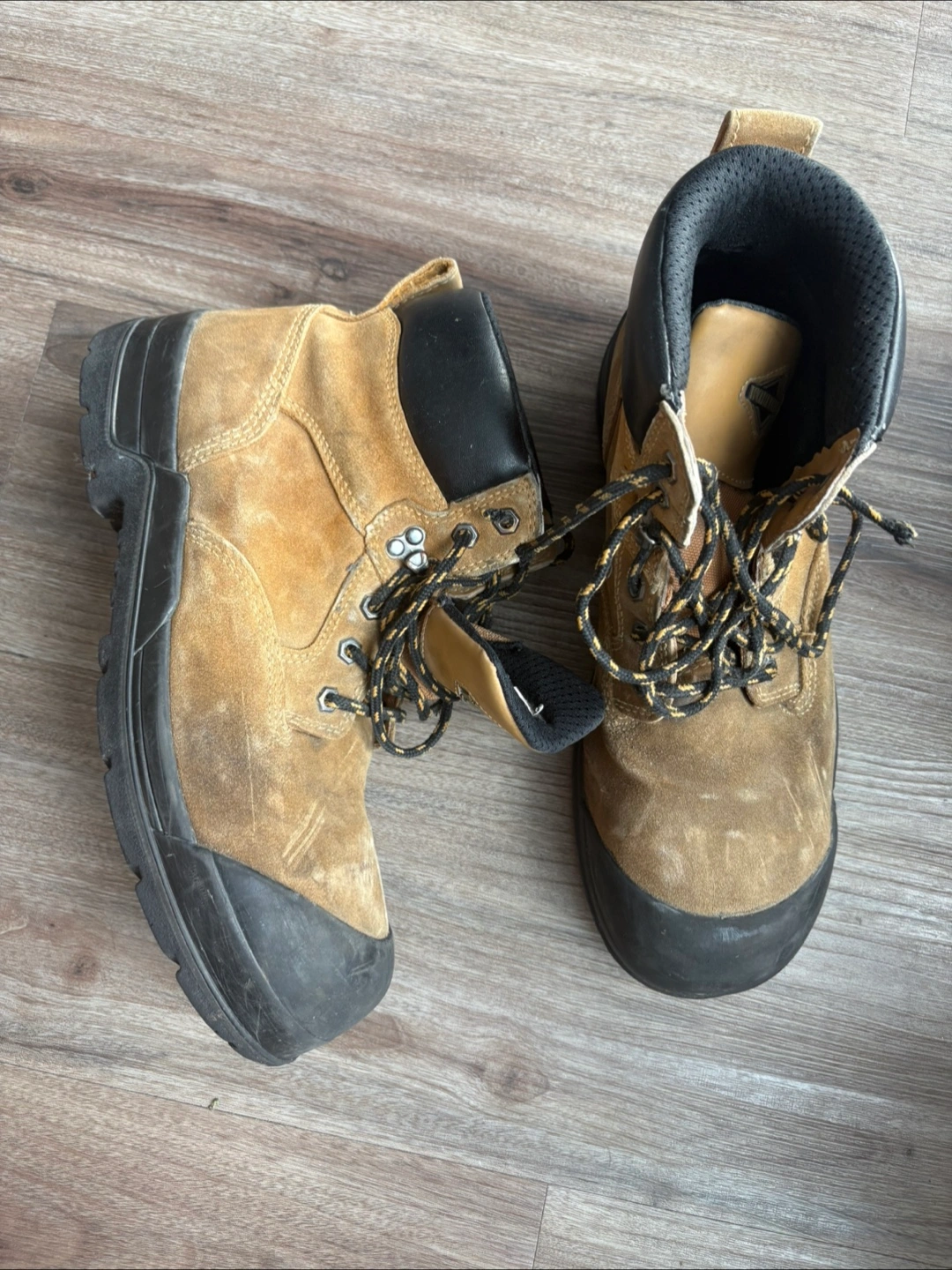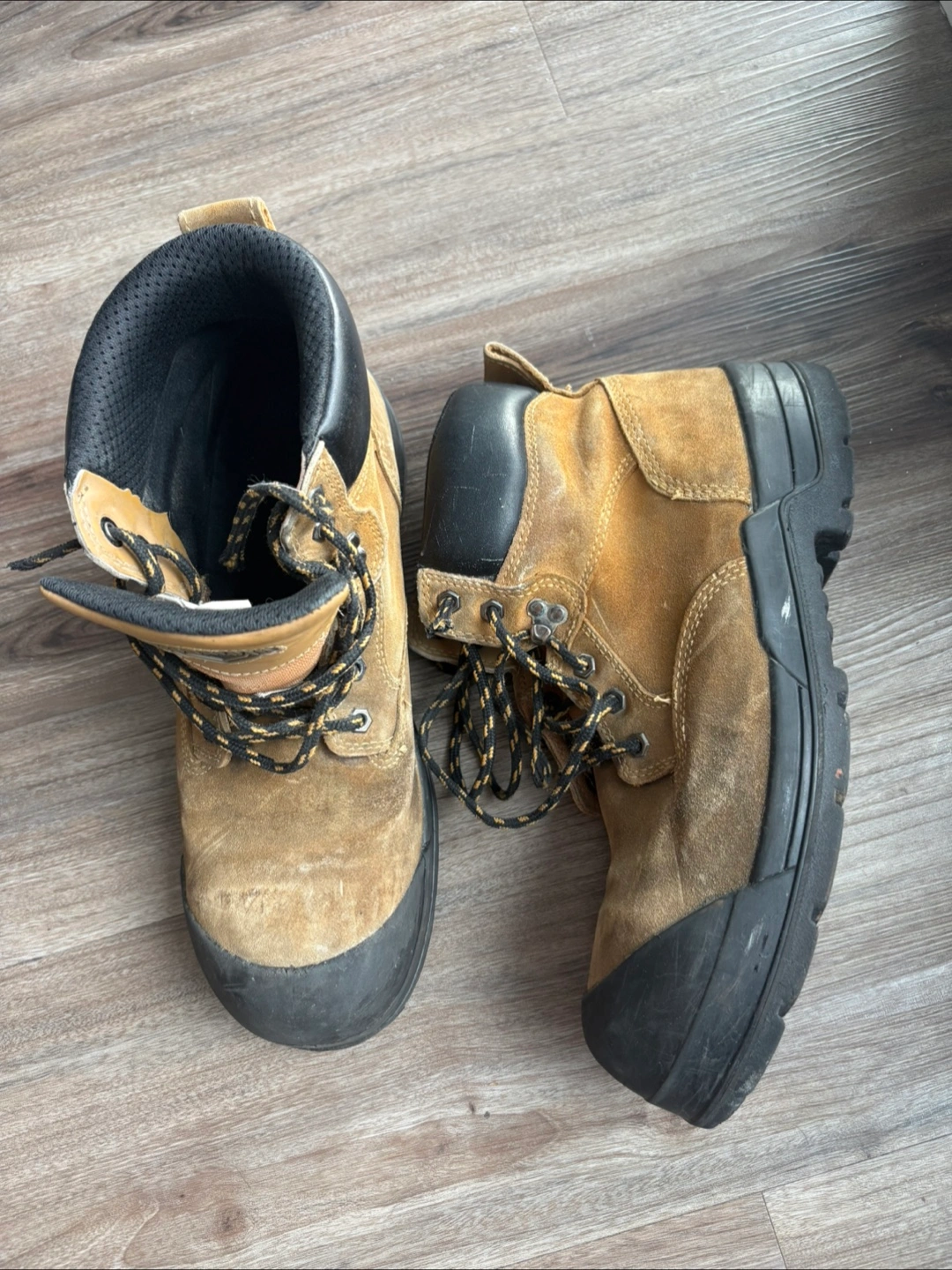 Light brown work boots. Black soles and black lining around the ankle. The laces are black and yellow. These boots are great for a hike in the forest.