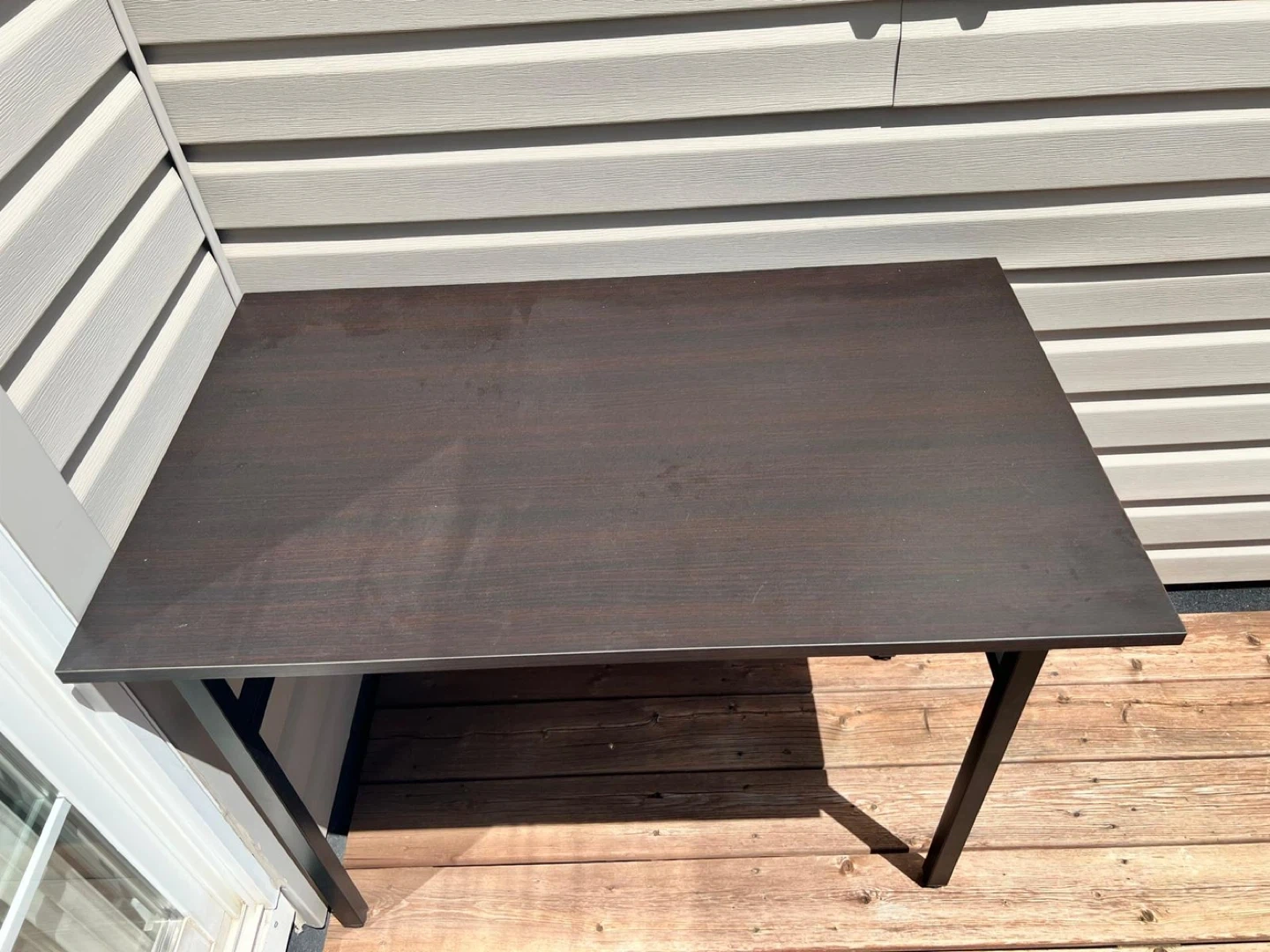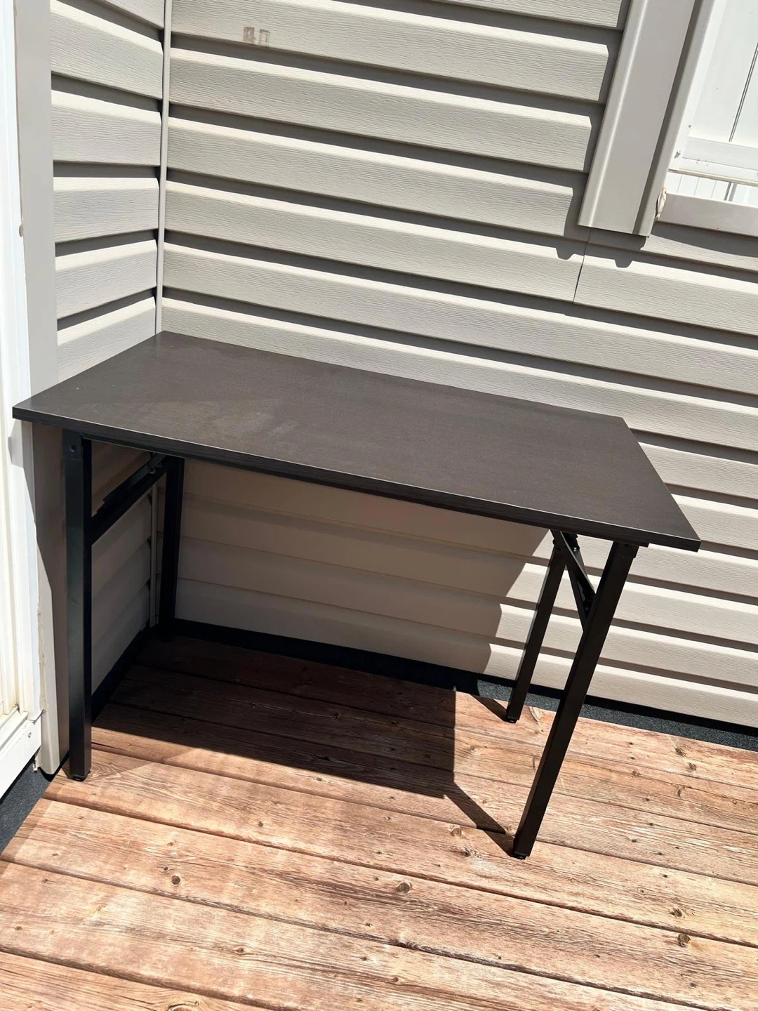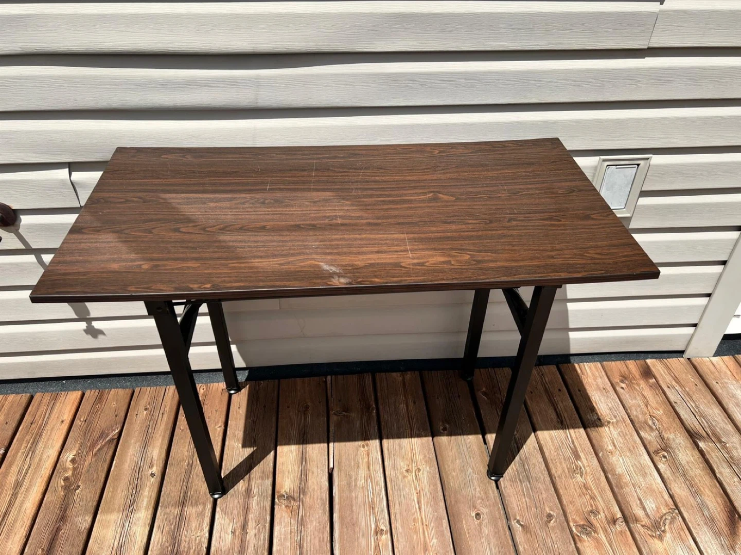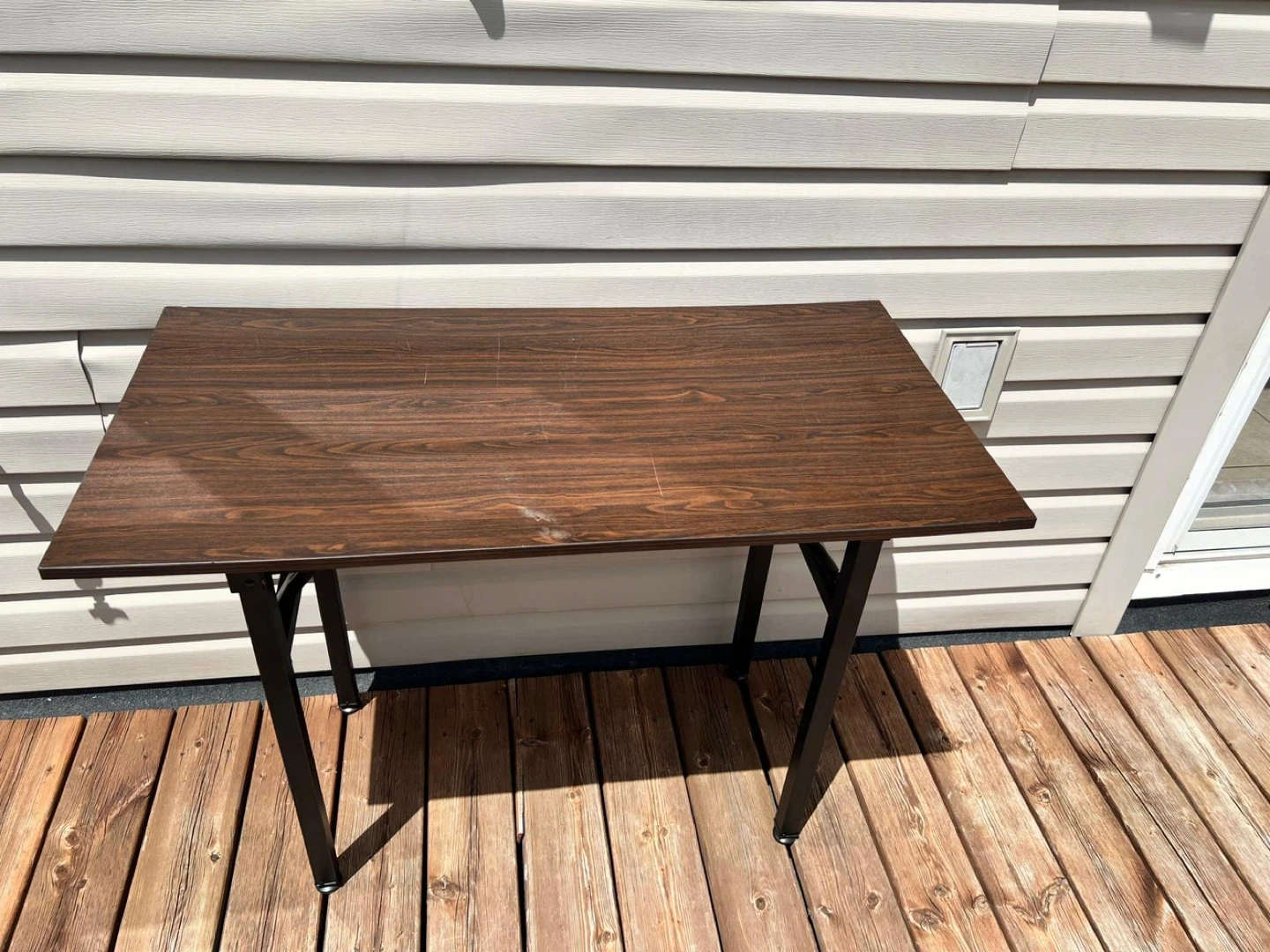 Selling 2 tables at $35 each. Both in good condition and perfect for small spaces or temporary setups. brown with a wood grain finish and has black metal legs. Great for crafts, hobbies, or as an extra workspace! - Tables don’t fold