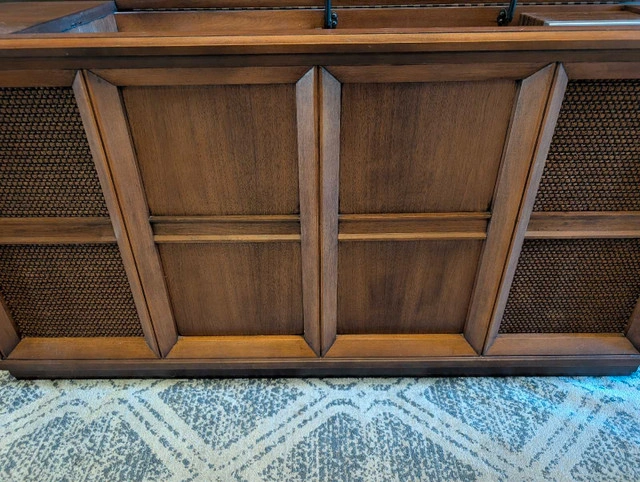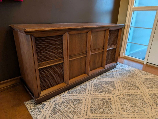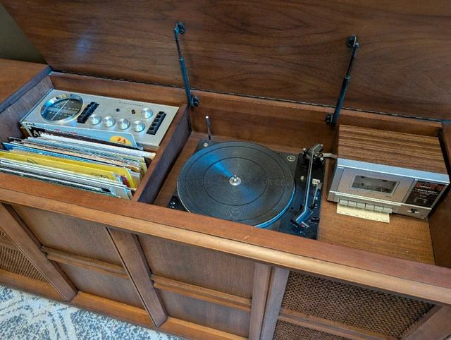 This vintage record player is a fantastic find! The unit includes a built-in record player, radio, and cassette player. This unit shows minor signs of wear (ex. A few water drop marks on lid).
