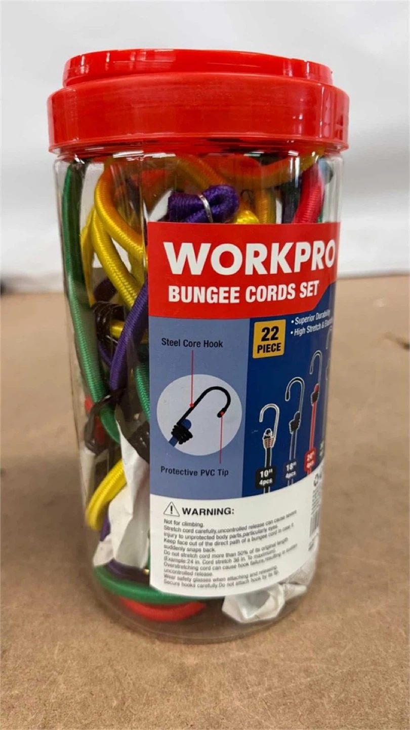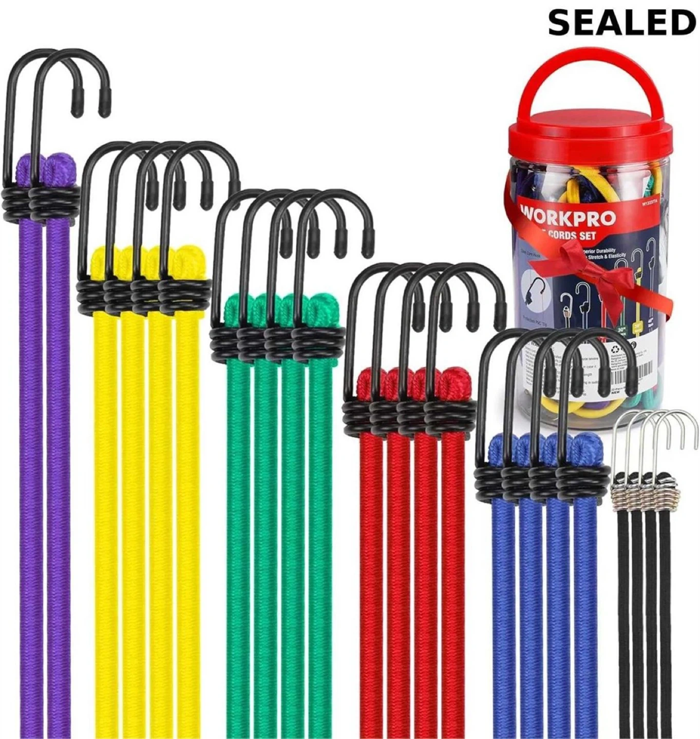 I'm selling a brand new WORKPRO 22-piece bungee cords set! This set includes a variety of sizes and colours, conveniently colour-coded by length. The cords feature steel core hooks with protective PVC tips. Each cord has a thickness of 8mm and can stretch up to 2 times its length. The set contains: - 48" x2 - 36" x4 - 30" x4 - 24" x4 - 18" x4 - 10" x4 Great for securing items during transport or storage!