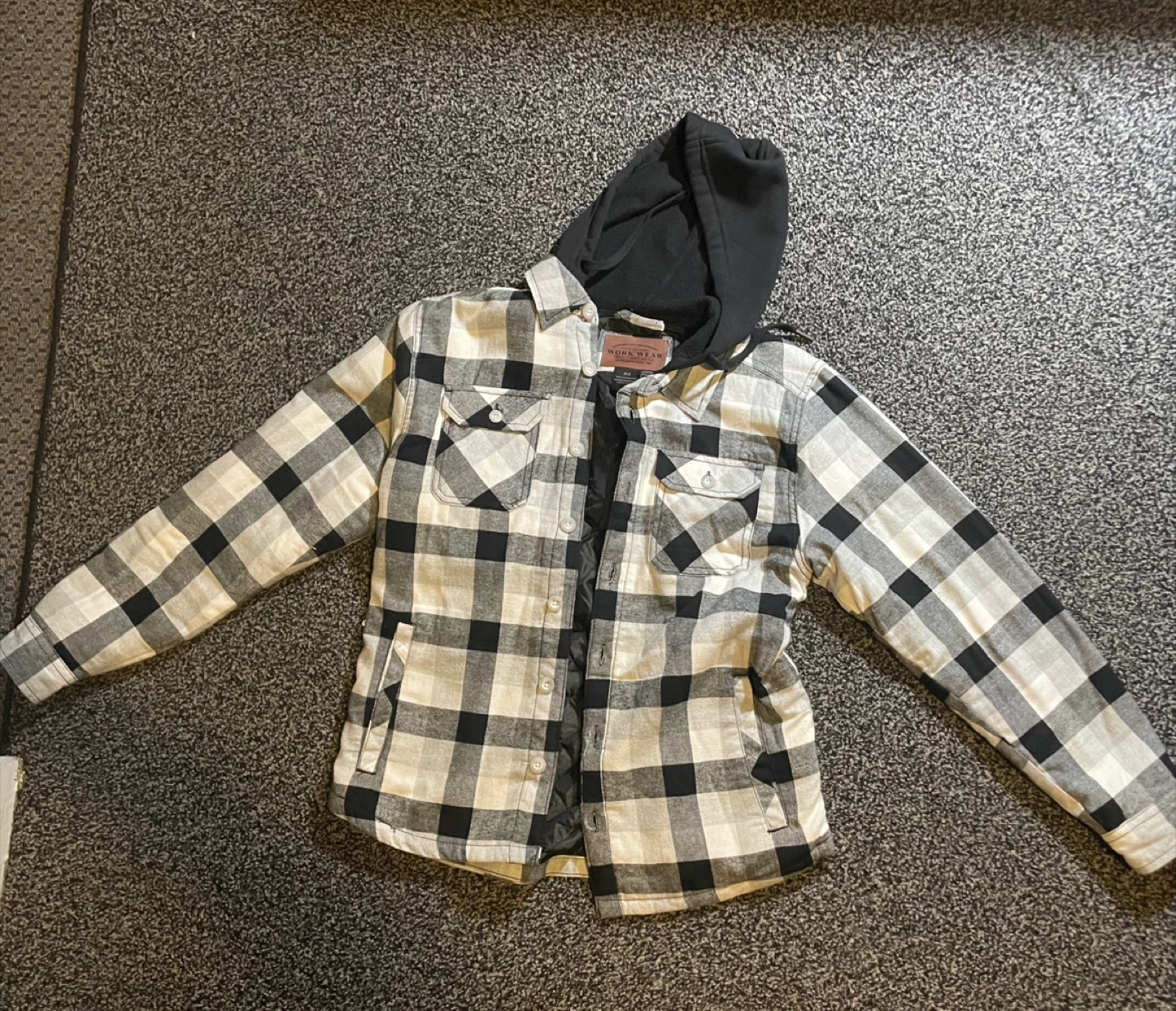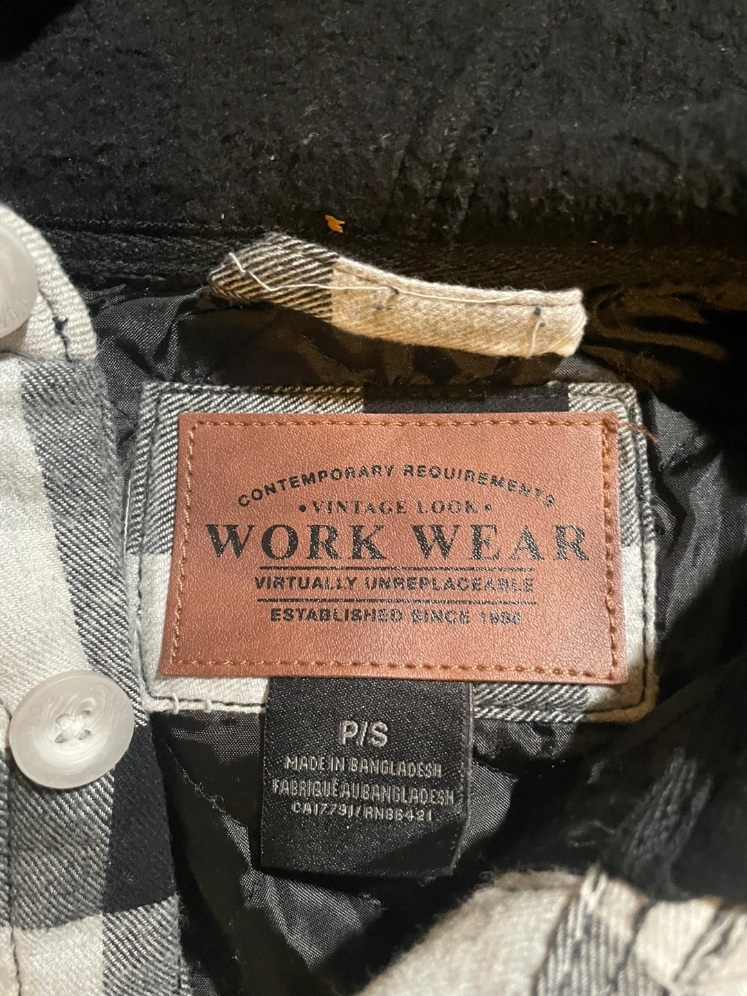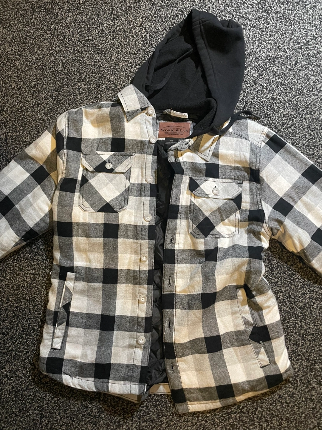 a cozy Workwear jacket with a black and white plaid pattern and a black hood. It's got a quilted lining to keep you warm on those chilly days. Perfect for layering! Size Men’s small but can fit medium . Jacket is in good condition used about 1-2 times only. Bought it for around 60-65 dollars on winners. Lots of pockets for storage