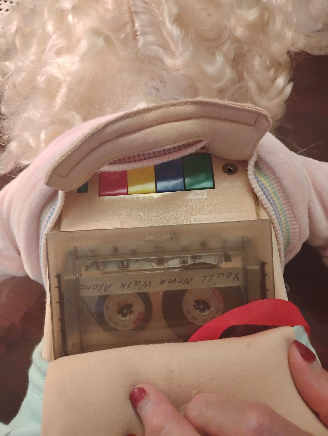 Selling a cute vintage doll with blonde curly hair, blue eyes, and a sweet smile! She's wearing a striped shirt and a mint green skirt with pink shoes. Great for collectors or as a charming addition to any doll collection!
