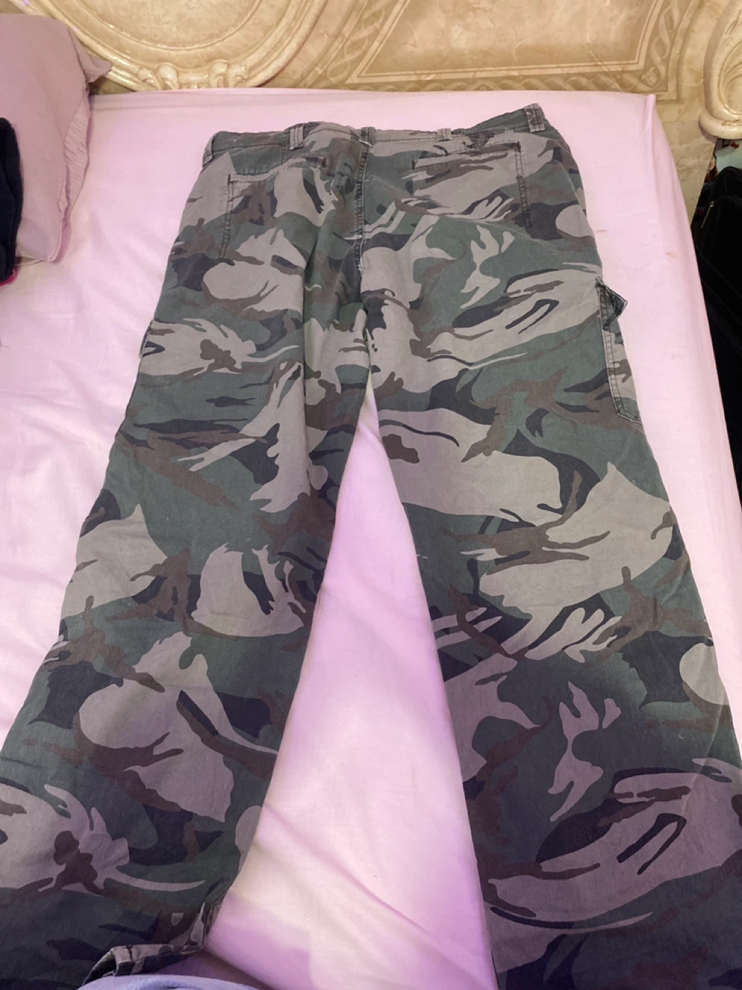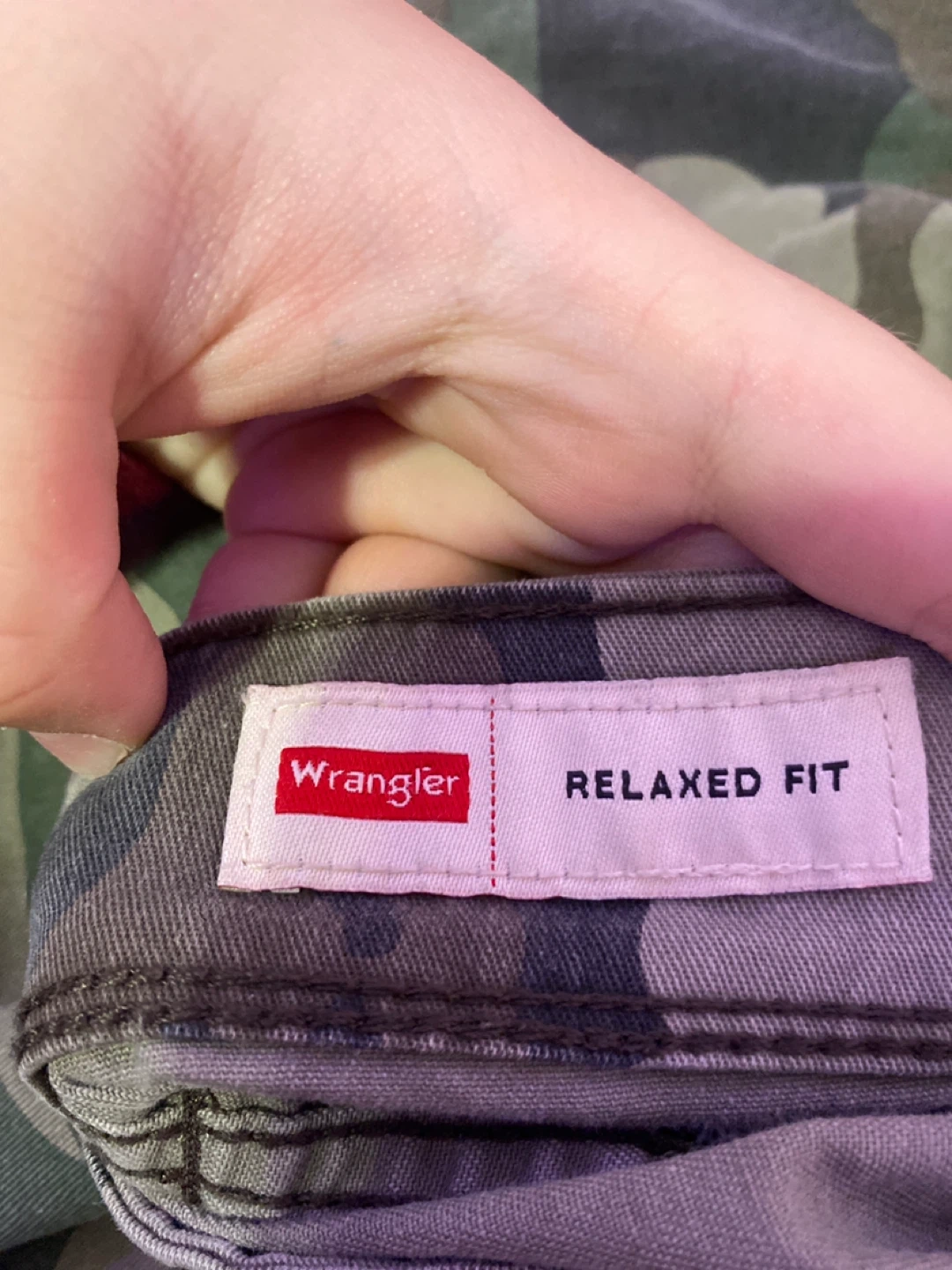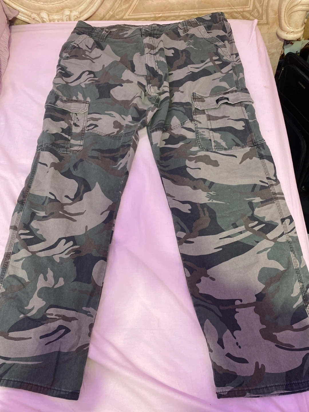 Selling a pair of Wrangler camo cargo pants in a relaxed fit. They're in great shape. These are super comfy and practical with lots of pocket space
