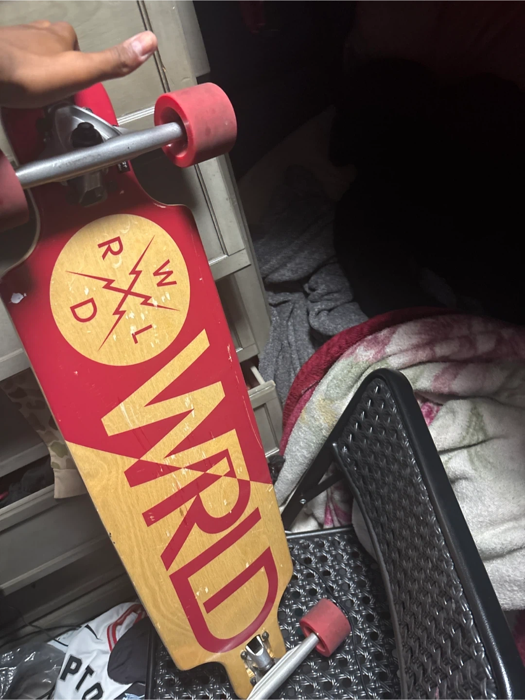 Selling a used WRD longboard. It has a red and yellow design with red wheels. Good for cruising around town!