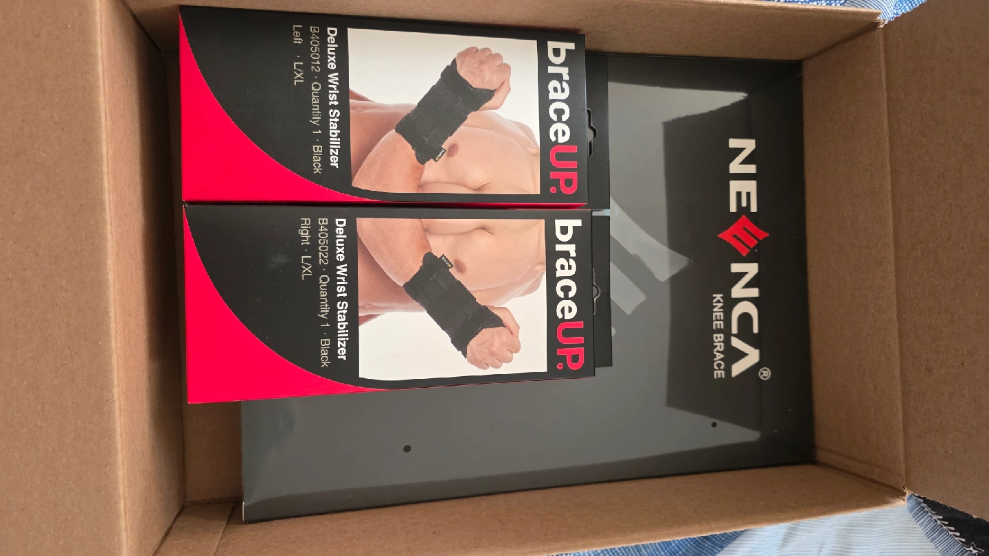 I have two braceUP Deluxe Wrist Stabilizers, size L/XL, still in their boxes! One is for the left wrist (B405012) and the other is for the right wrist (B405022). Both are black also 1 large knee brace 2 elbow braces all new in box never used ordered too many