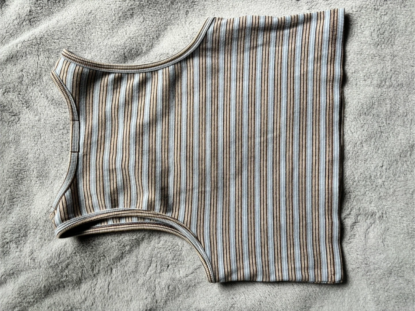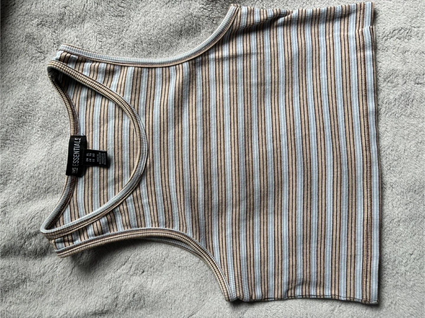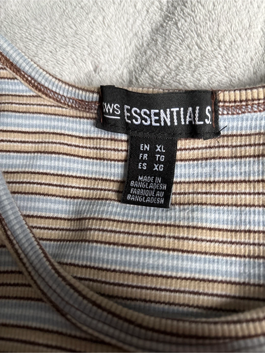 Here's a cute WS Essentials tank top! It features a striped pattern in light blue, brown, and beige. The size is XL
