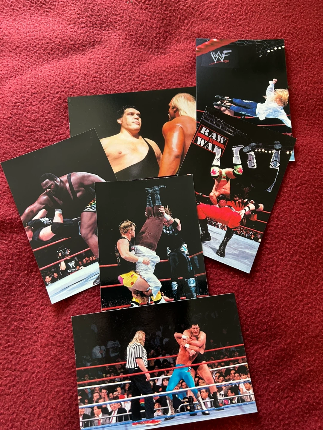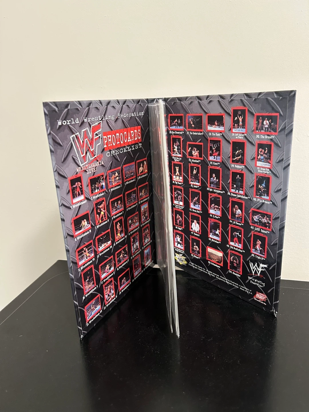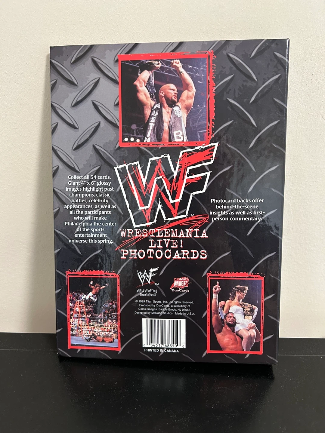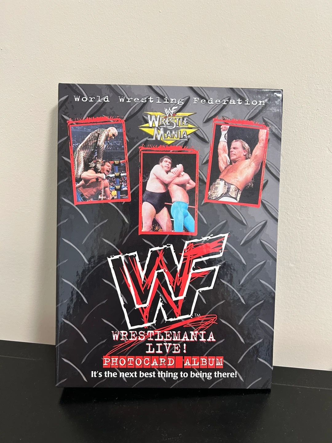 Selling a WWF Wrestlemania Live! photocard album. Giant 2-sided glossy images highlight past champions, classic battles, celebrity appearances as well as all the participants who help make Wrestlemania the center of the sports entertainment universe every spring. Photocard backs offer behind-the-scene insights as well as first-person commentary. Comes with 6 photocards.