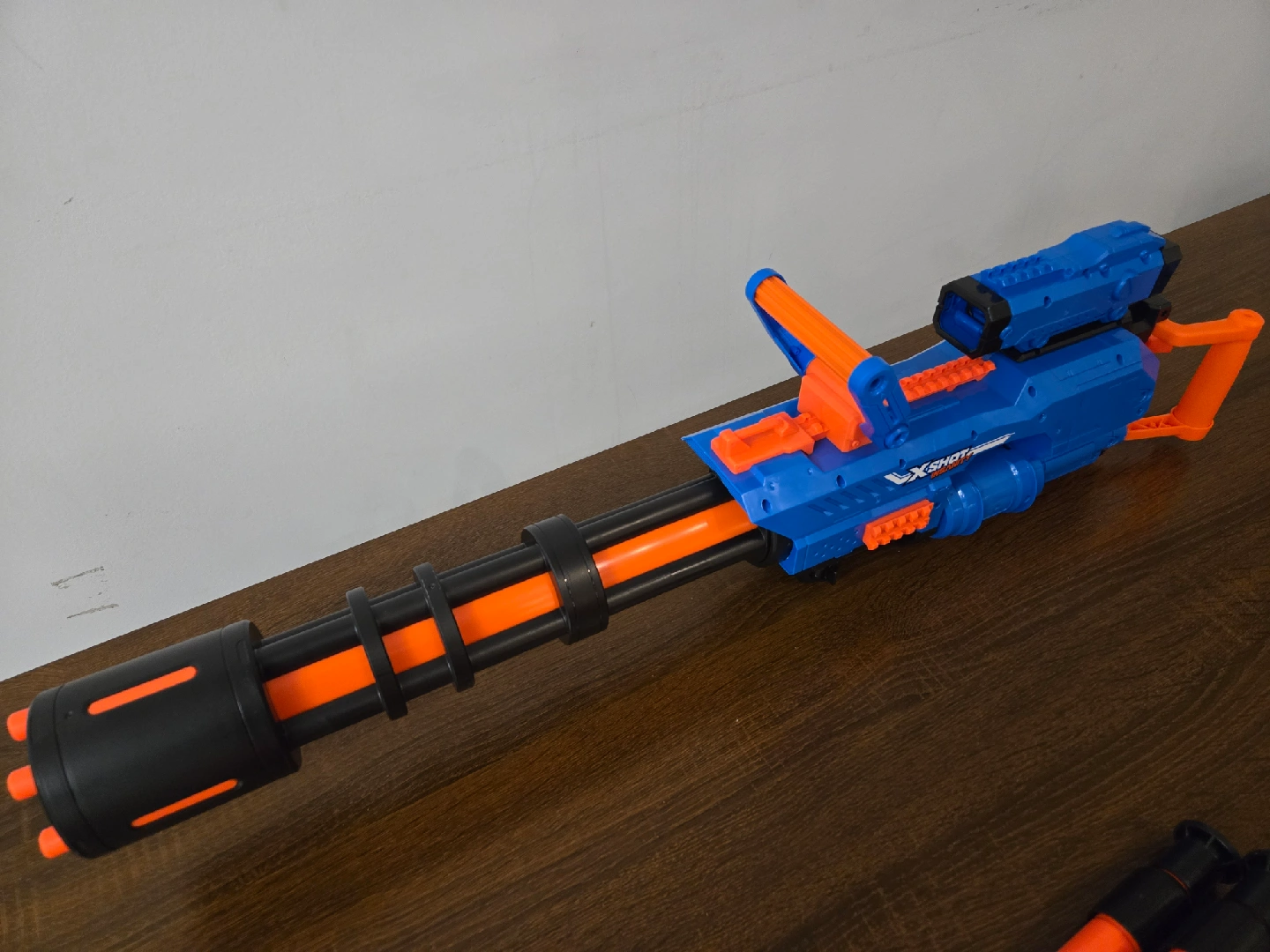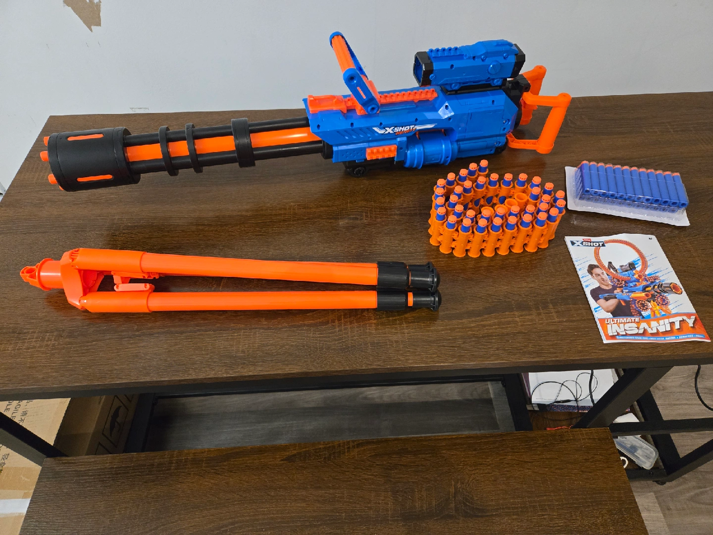 Selling an X-Shot Insanity Motorized Rage Fire Blaster. It comes with a tripod and 72 soft and safe darts and a belt ; hardly even used. This toy is in great condition and ready for some action-packed fun. Batteries included. great for family fun too.