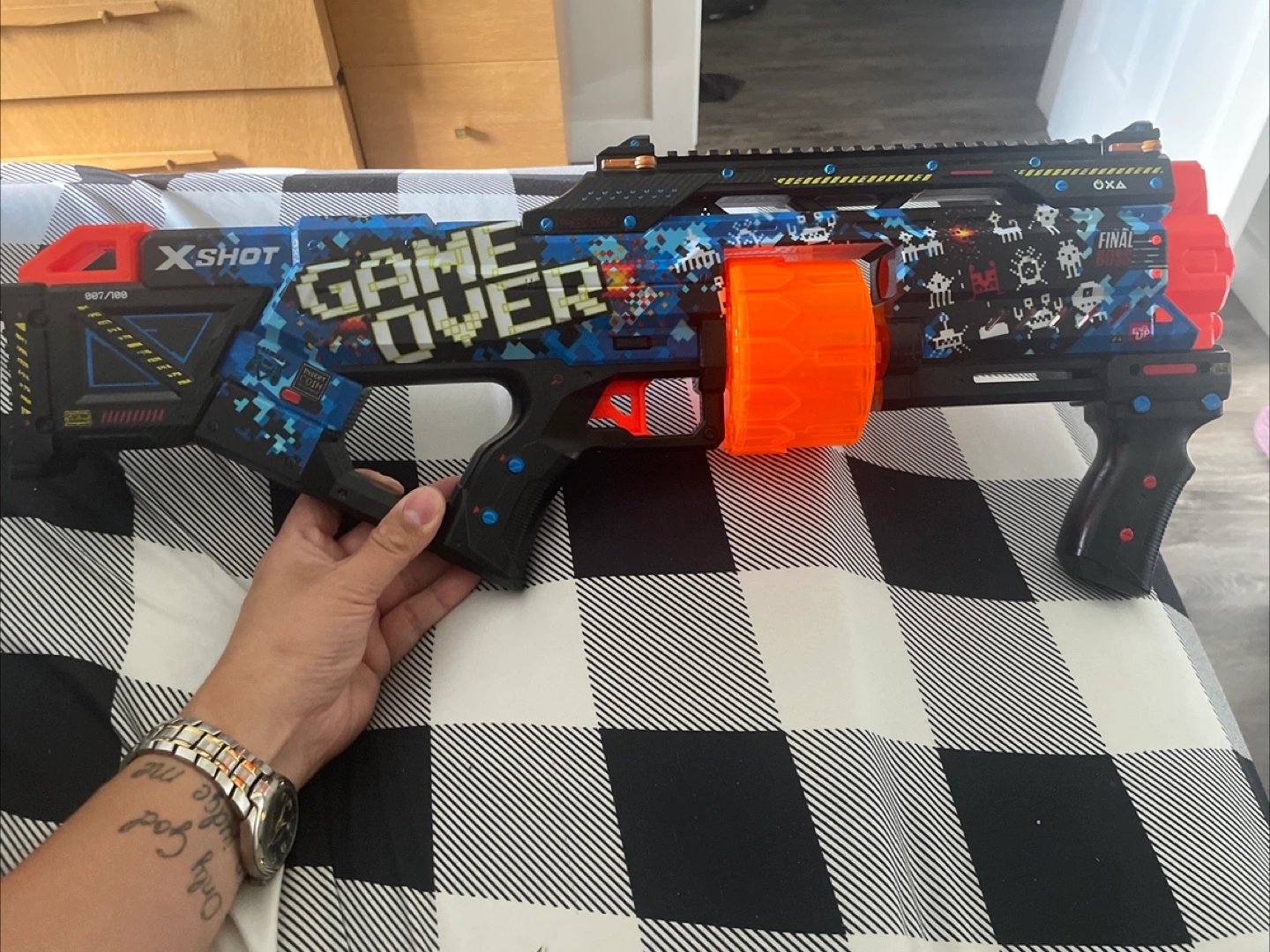 Selling an X-Shot toy blaster with a cool 'Game Over' design! It looks like it's in great shape and ready for some fun. Perfect for kids or collectors who love toy blasters