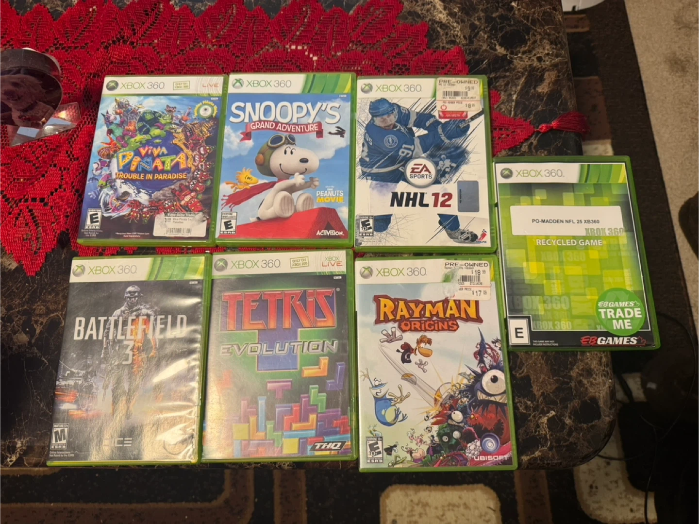 Selling a collection of Xbox 360 games! Titles include: - Viva Pinata Trouble in Paradise - Snoopy's Grand Adventure - NHL 12 - PC-Madden NFL 25 - Battlefield 3 - Tetris Evolution - Rayman Origins All games are pre-owned and ready for a new home