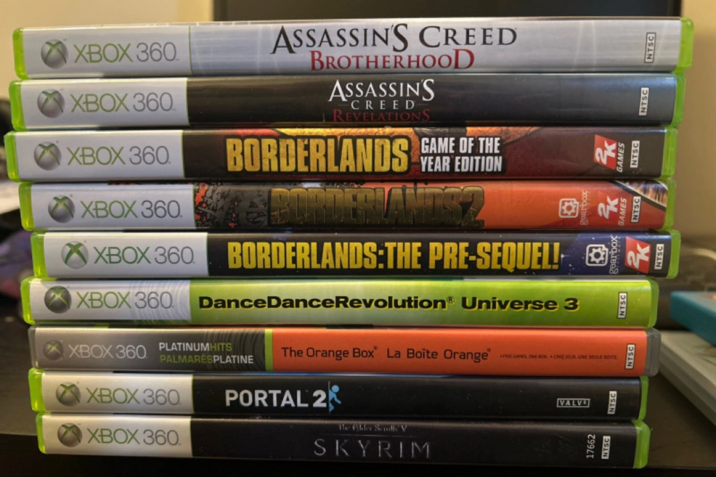 Selling a collection of Xbox 360 games, complete with manuals. All games, manuals and cases are like new. Can be bought as a lot or individually. Price listed is for the lot. - Assassin's Creed Brotherhood $5 - Assassin's Creed Revelations $5 - Borderlands Game of the Year Edition $10 - Borderlands 2 $10 - Borderlands: The Pre-Sequel! $5 - DanceDanceRevolution Universe 3 $5 - The Orange Box $20 - Portal 2 $10 - The Elder Scrolls V: Skyrim $10