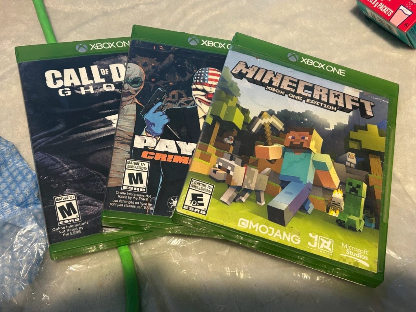 Selling a few Xbox One games. Includes: - Call of Duty Ghosts - case is a disgrace but the disk is looks brand newish. - Payday 2 - case is decent and the disc is like new. - Minecraft: Xbox One Edition some scuffs but playable. Case is a disgrace. Looking to sell all 3 for $10. Not $10 each. I want them gone asap. Cash and pick up only.