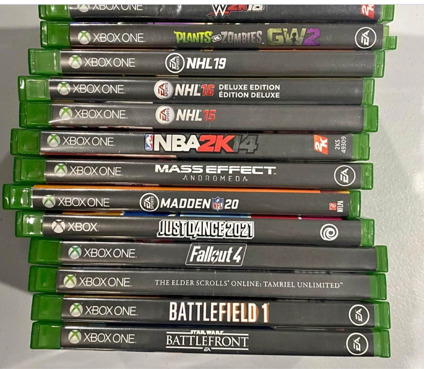 Selling a collection of Xbox One games! Titles include: - WWE 2K18 - Plants vs Zombies: Garden Warfare 2 - NHL 19 - NHL 16 Deluxe Edition - NHL 15 - NBA 2K14 - Mass Effect: Andromeda - Madden 20 - Just Dance 2021 - Fallout 4 - The Elder Scrolls Online: Tamriel Unlimited - Battlefield 1 - Star Wars Battlefront Great selection for any Xbox One gamer!