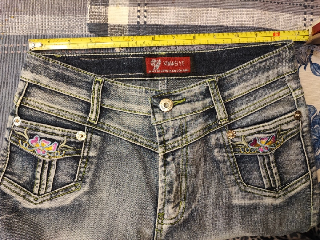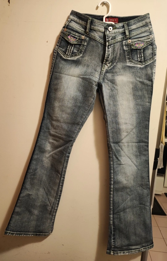 Cute XINWEIVE low waist flare jeans in a light wash! They feature embroidered details on the front and back pockets. The waist measures approximately 31 inches. Long: front 100cm/back 105 *Pick up only *Cash only *Please consider picking up your order at North York Substation before booking. Thanks!🙏
