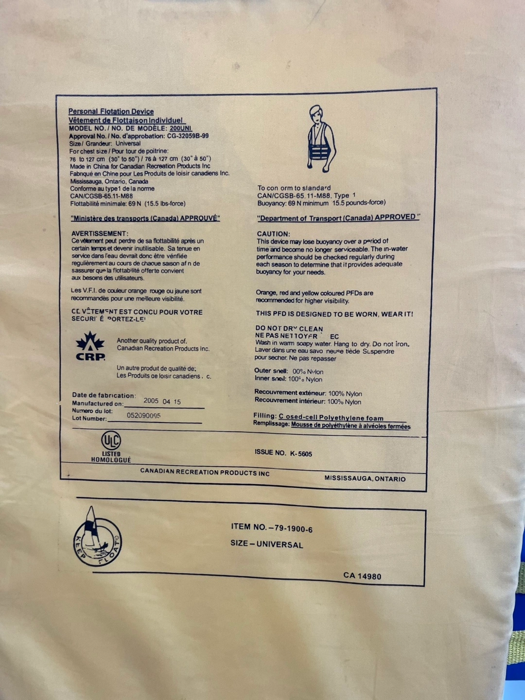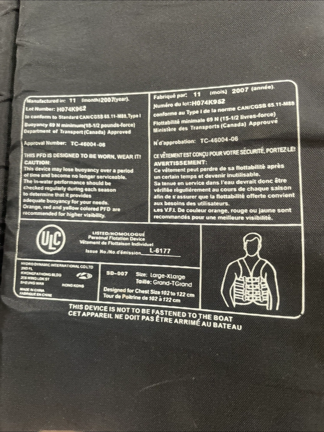 Selling a size XL life jacket. Universal size It is a Personal Flotation Device. Designed for chest sizes 102 to 122 cm. This PFD is designed to be worn!