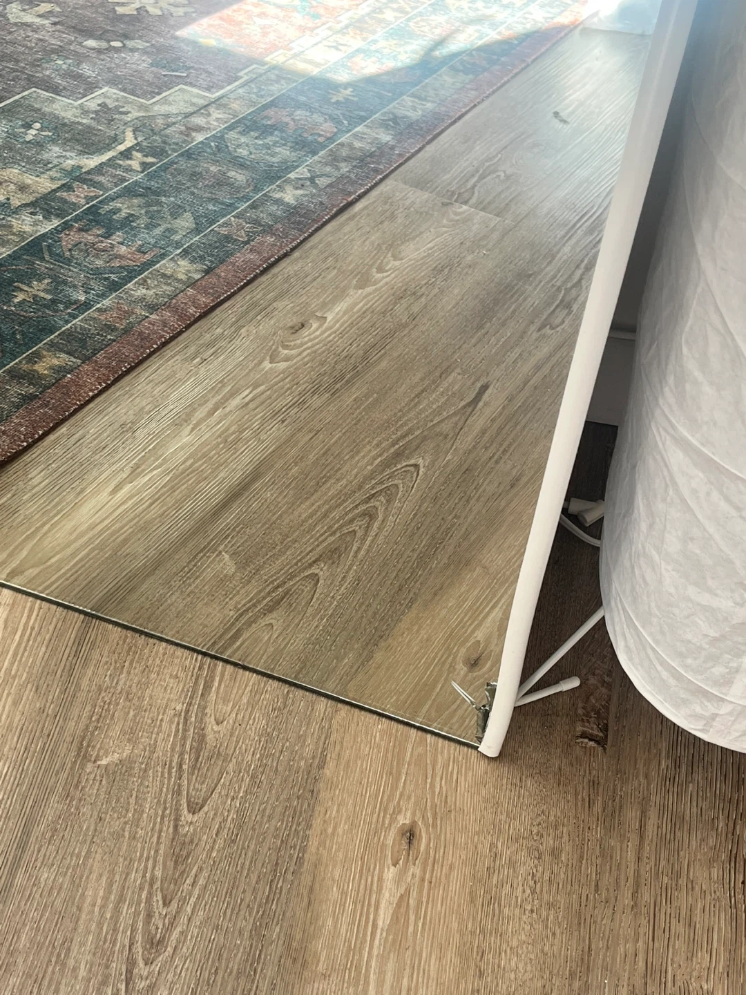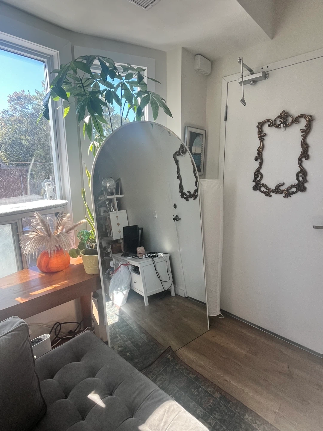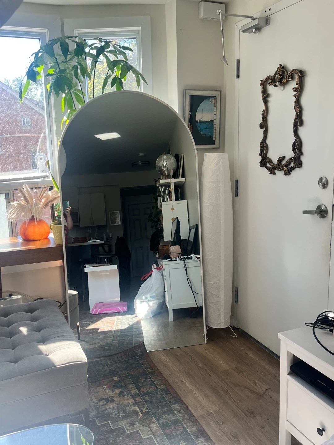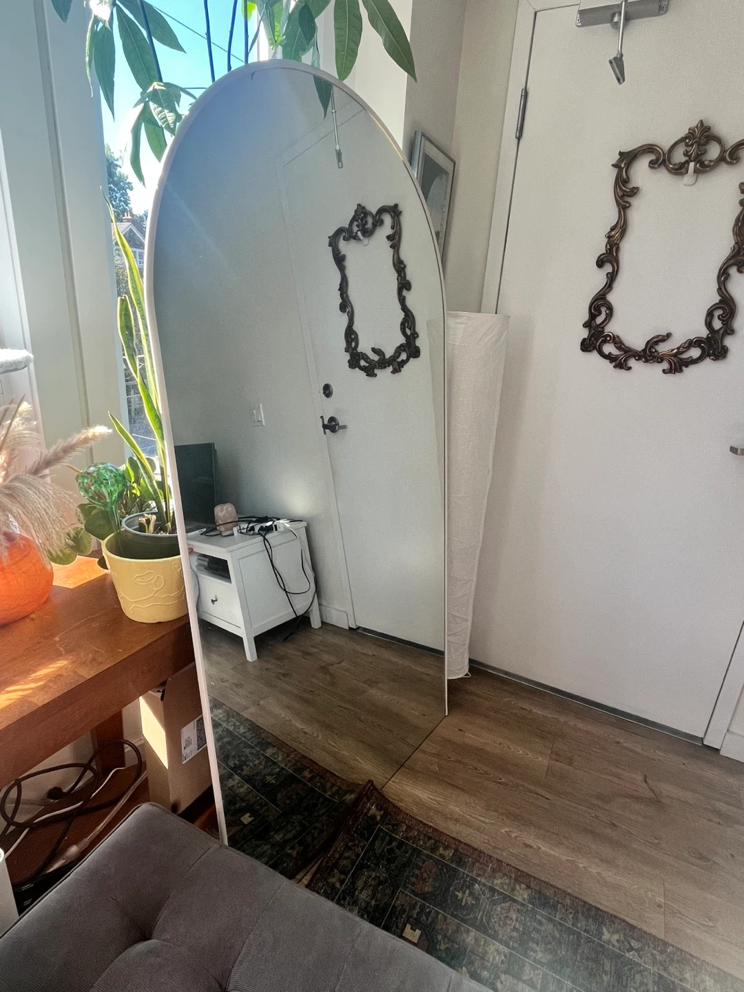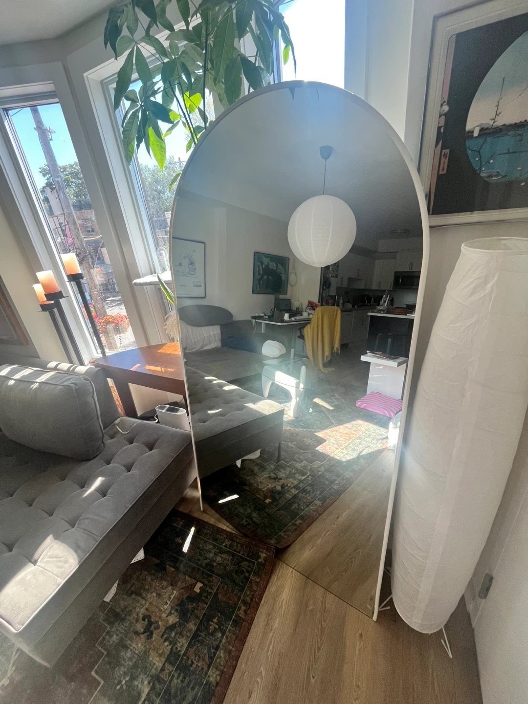 Massive rounded arch floor mirror w/ white frame. Dramatic, modern design perfect for a bedroom, entranceway, or living area. Guaranteed to facilitate excellent selfie-taking. Dimensions: - 70 inches tall - 37 inches wide Note: minor damage to the bottom right hand corner.