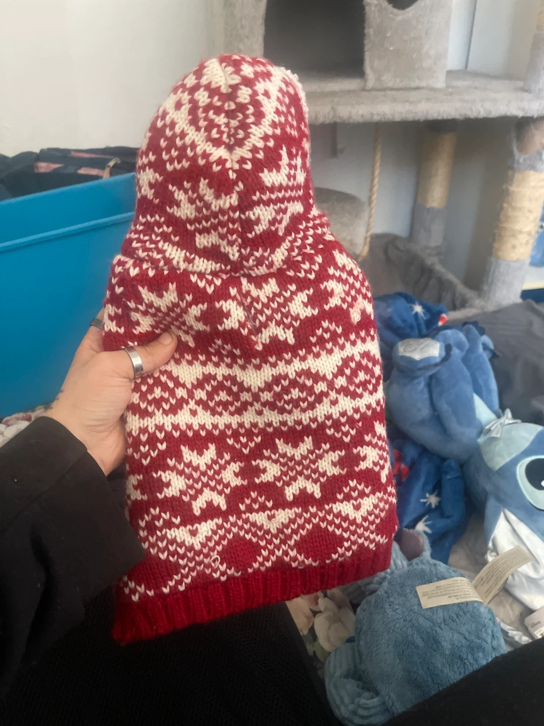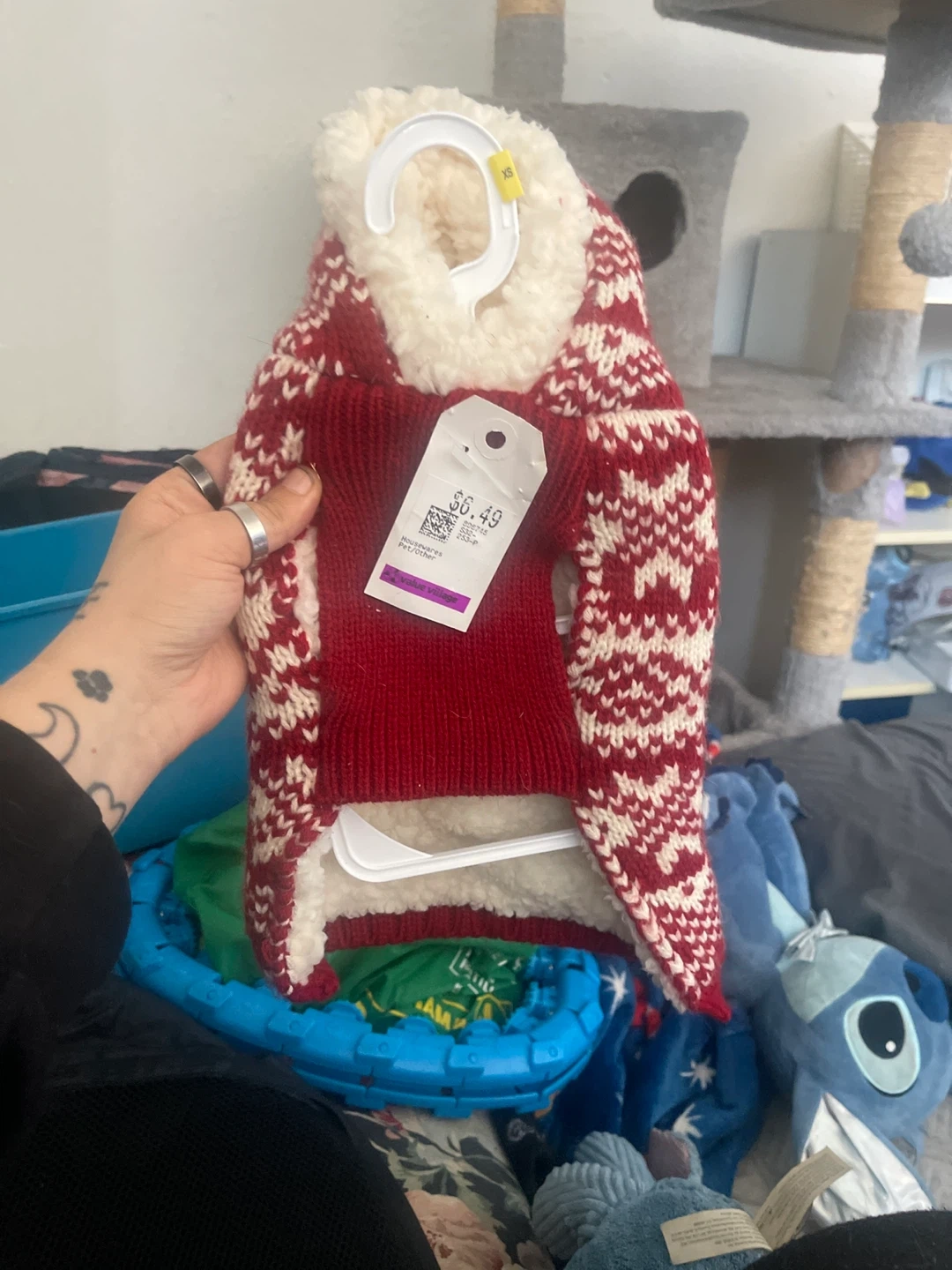 Keep your furry friend warm and stylish with this adorable dog sweater! It's a size XS and features a festive red and white pattern. Perfect for the chilly Canadian weather!