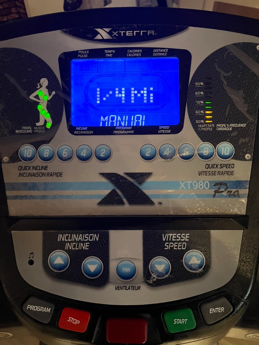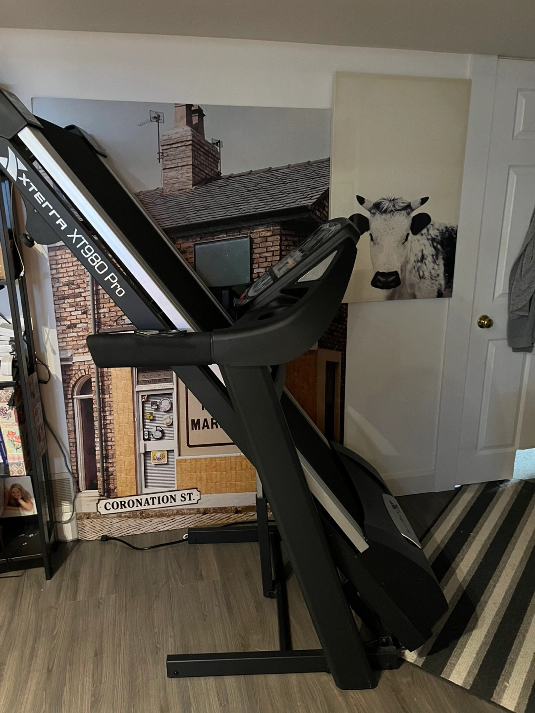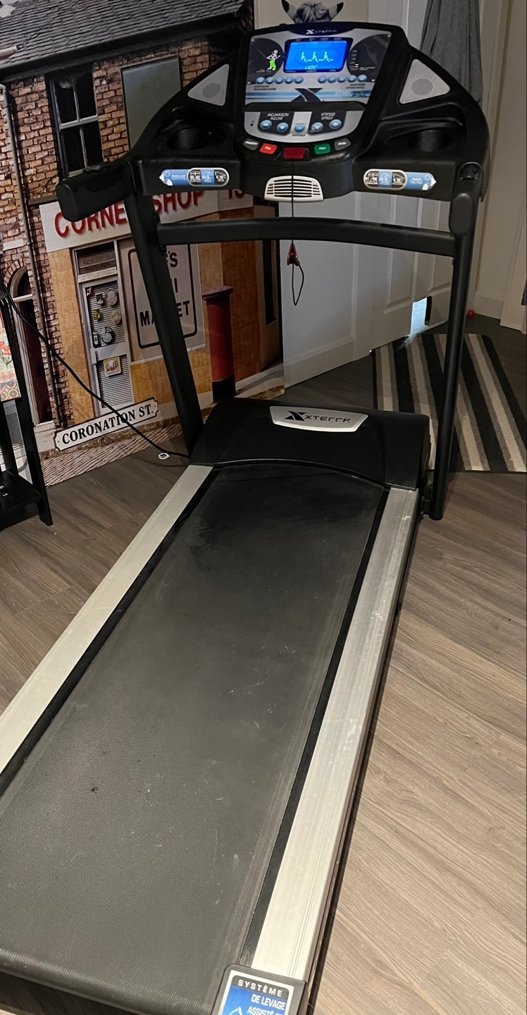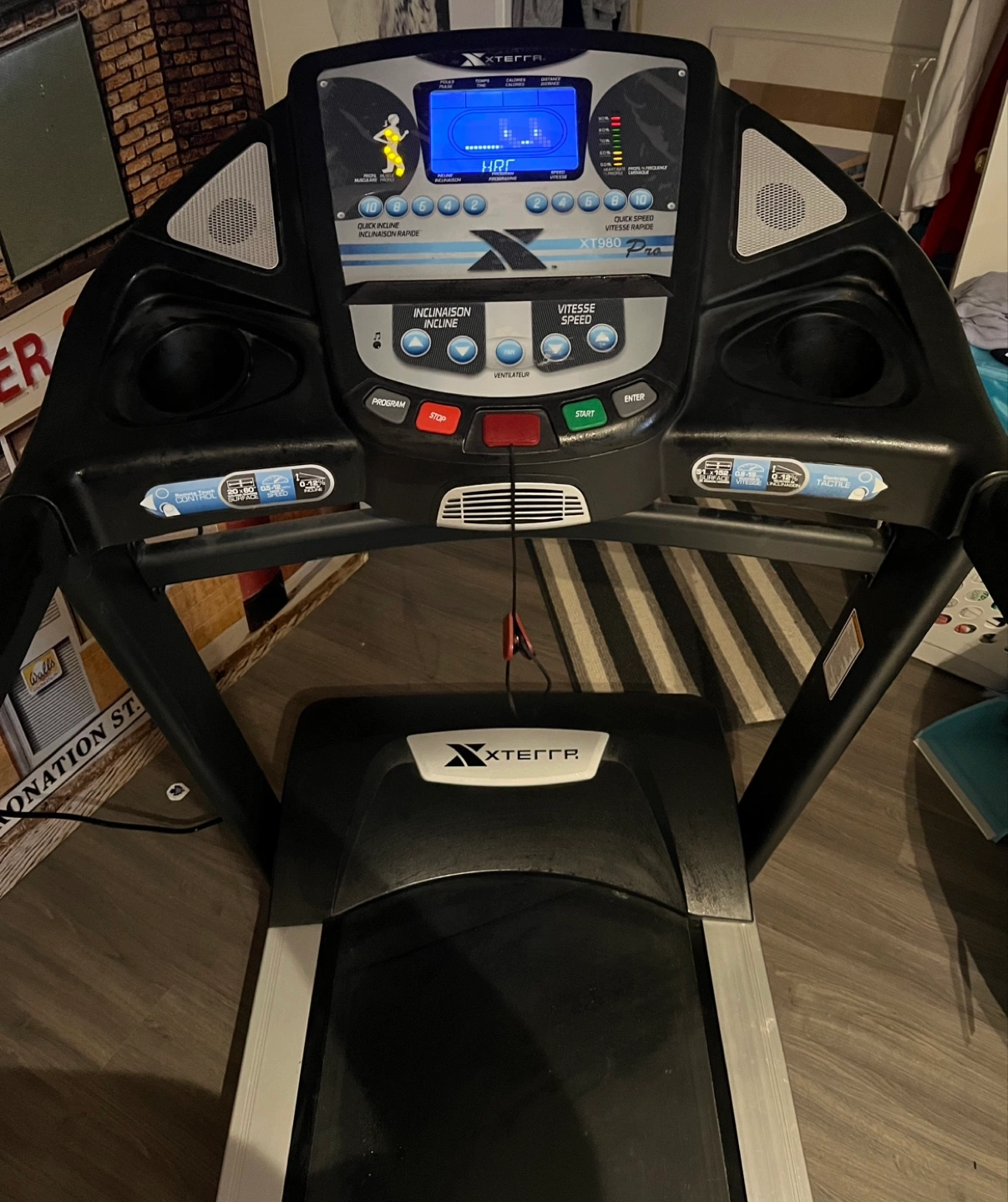 Used XTERRA XT980 Pro treadmill. Features a digital display, incline and speed controls, and a lift assist system. Good for home workouts.