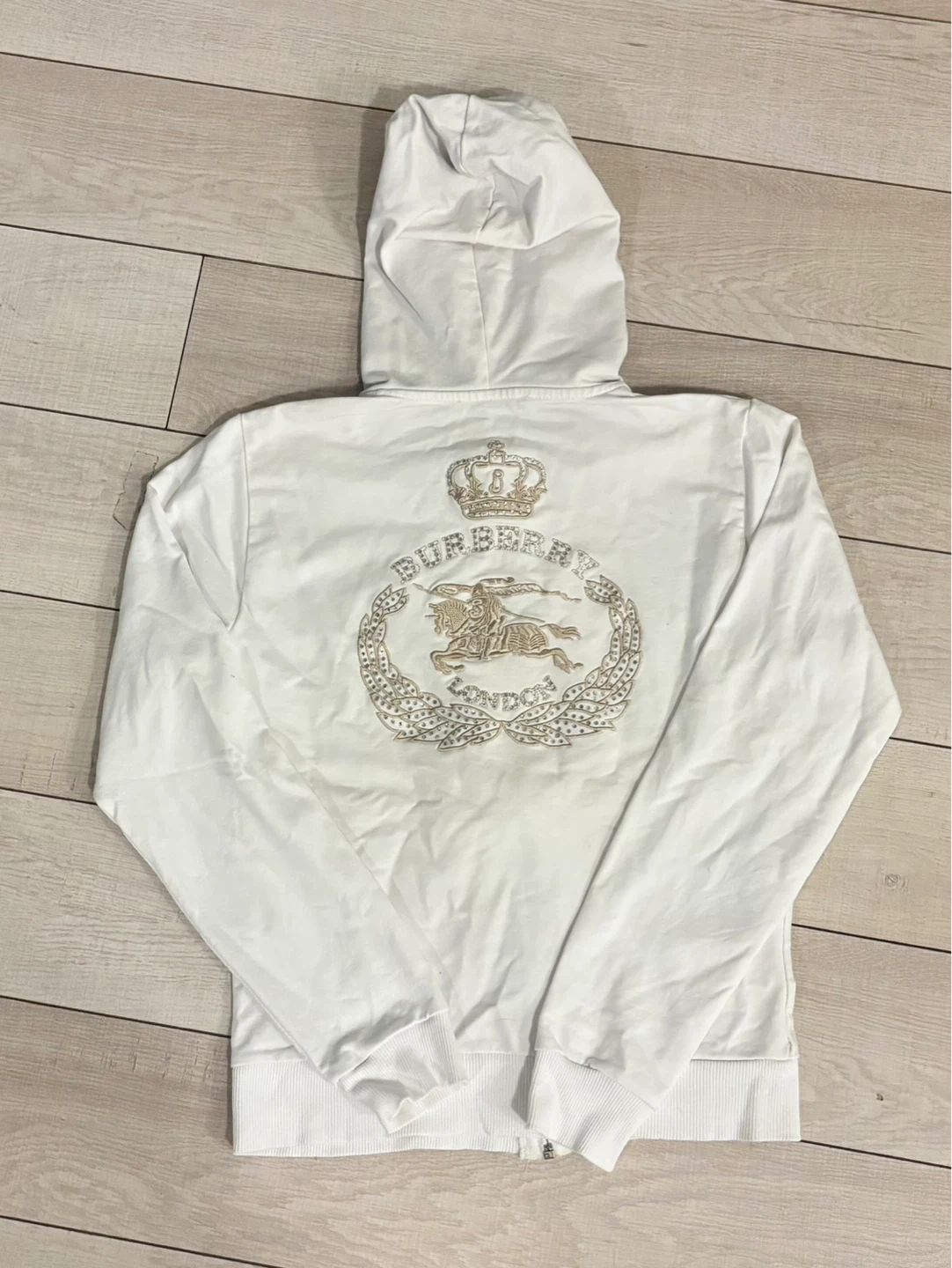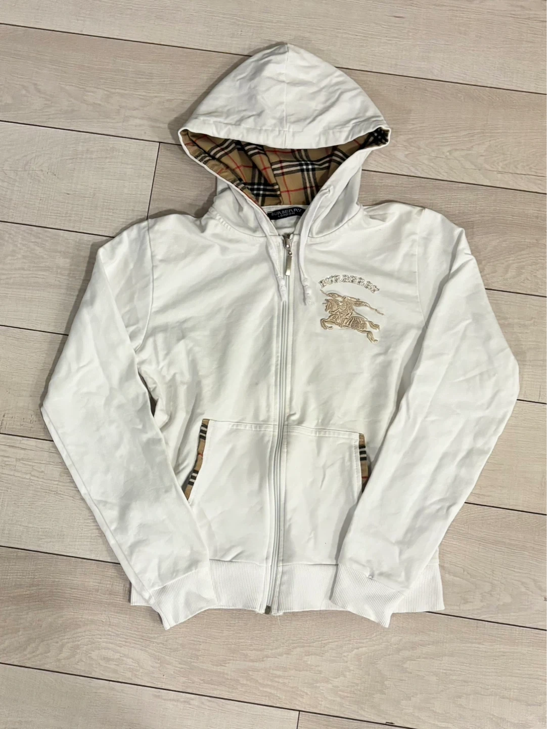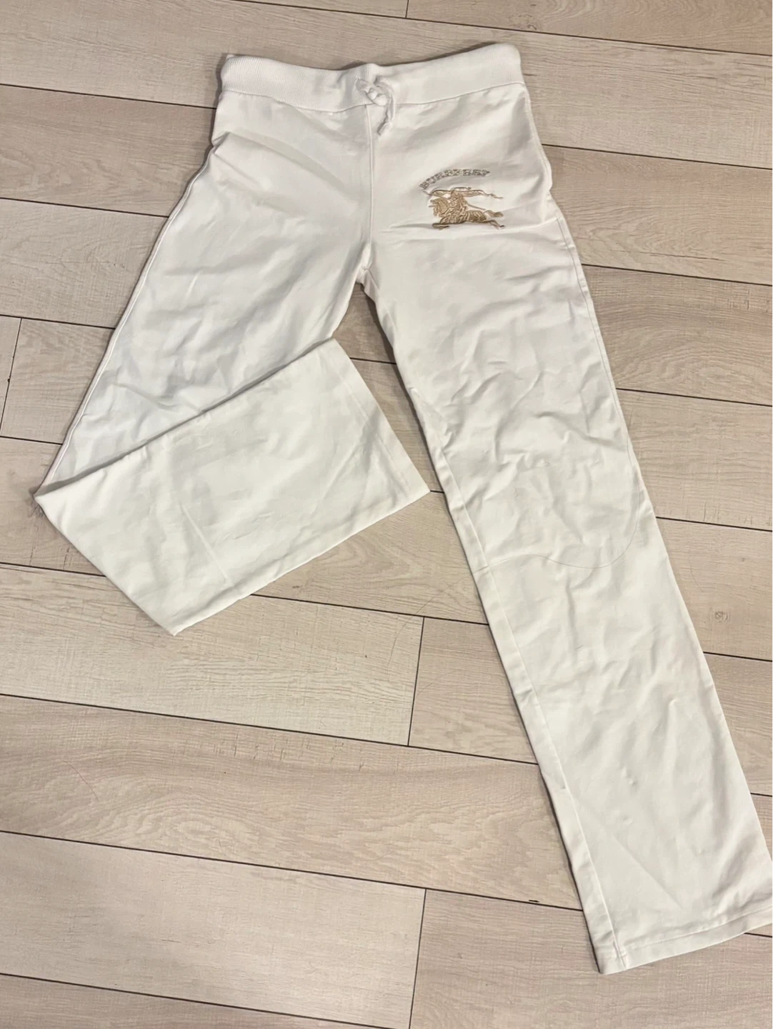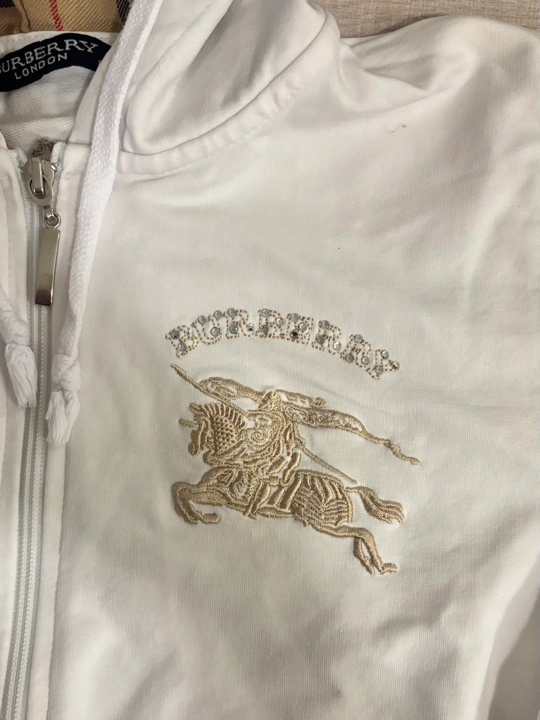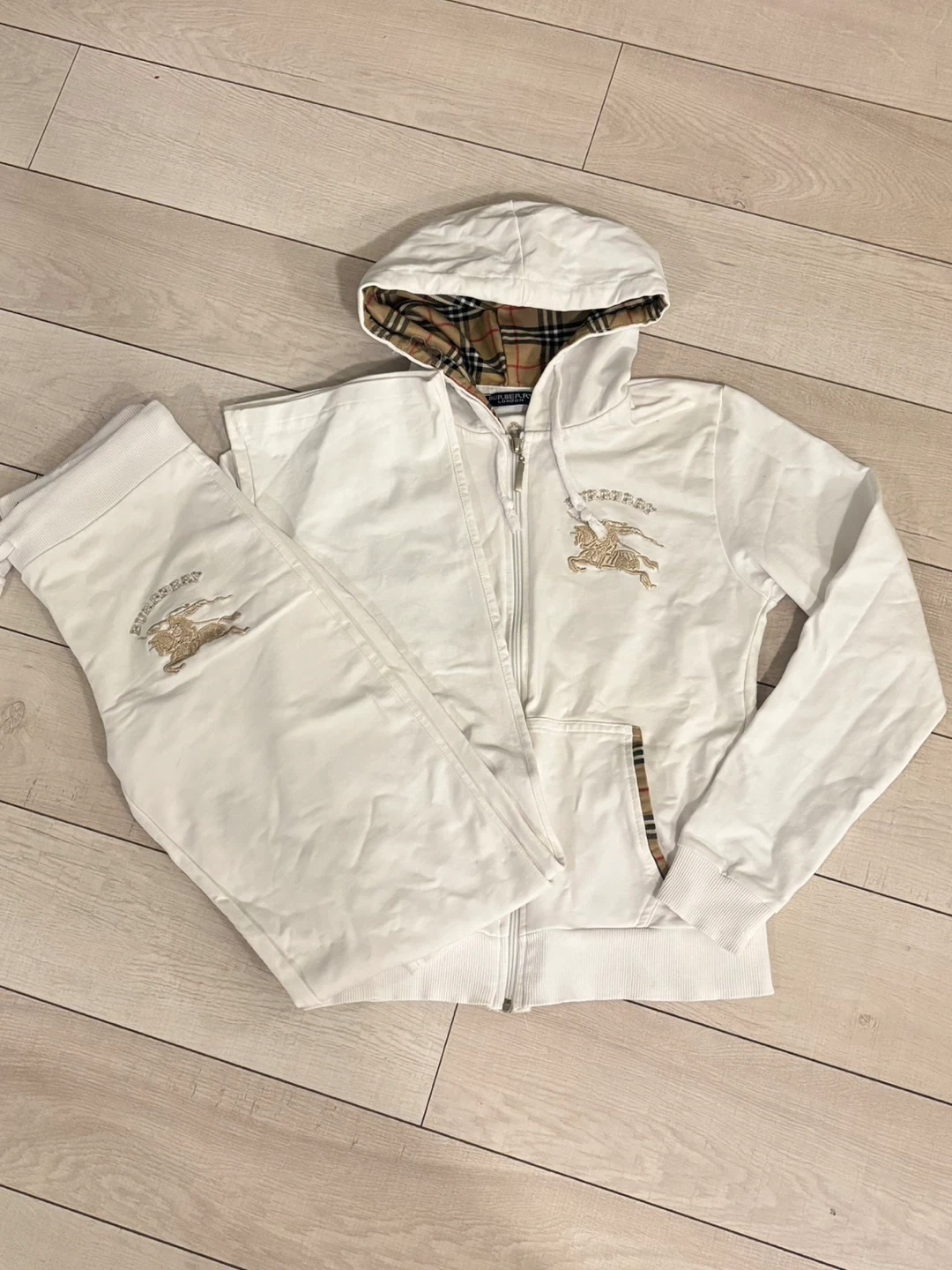 Selling a Burberry Y2k set in white! The set includes a zip-up hoodie and matching pants. The hoodie features the iconic Burberry logo and design. (Says size L but top fits xs,s and bottom fit s,m)