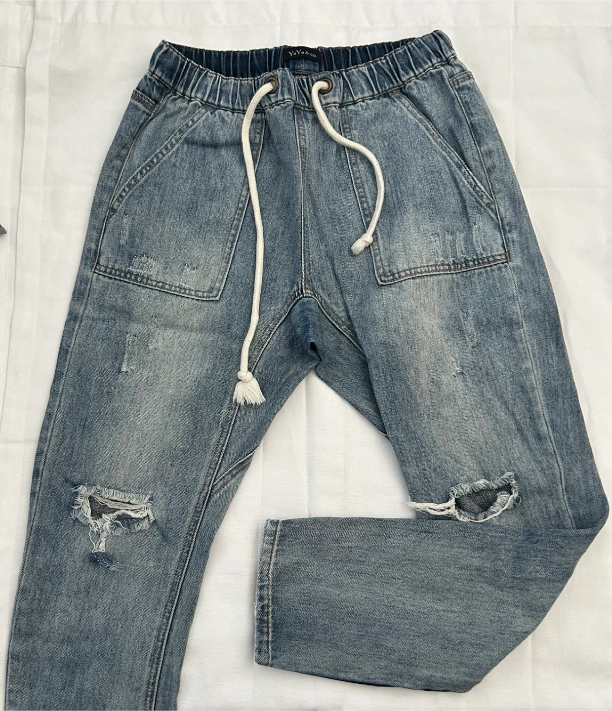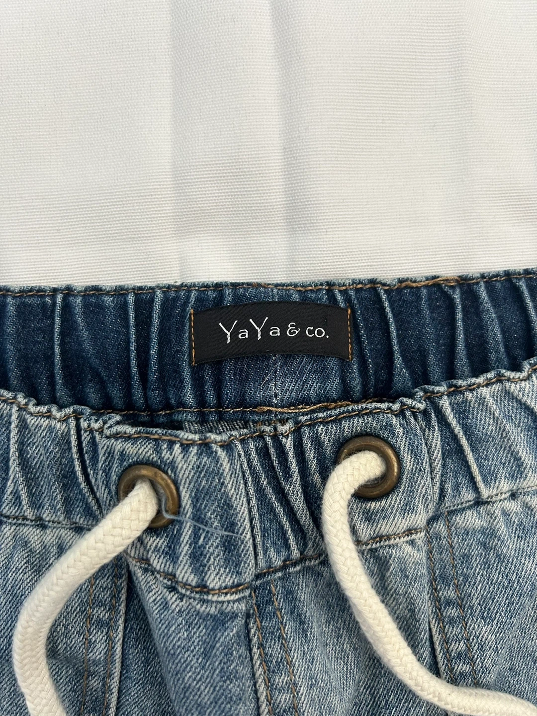 These are a pair of Ya Ya & Co. distressed denim jeans. They feature a drawstring waist and a relaxed fit. The jeans have a light wash and intentional rips for a stylish, worn look.