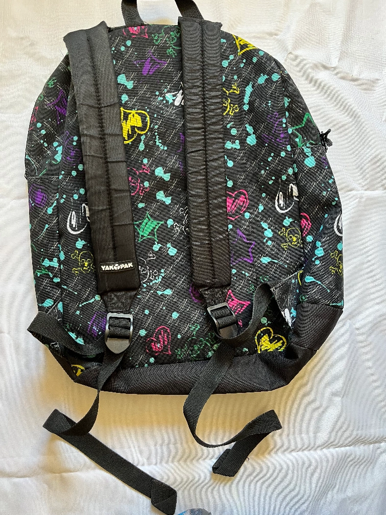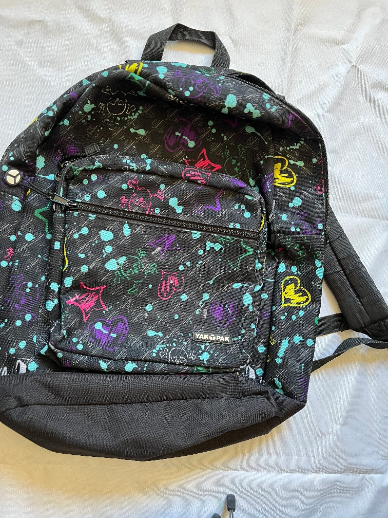 Looking to sell this cute Yak Pak backpack! It's black with a really fun and colourful design all over it. It's in great condition and perfect for school, travel, or just everyday use.