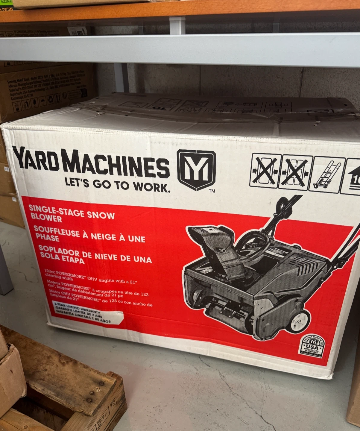 Selling a Yard Machines single-stage snow blower. It features a 123cc POWERMORE OHV engine with a 21-inch clearing width. This snow blower is ready to help you get the job done! Brand new in the box