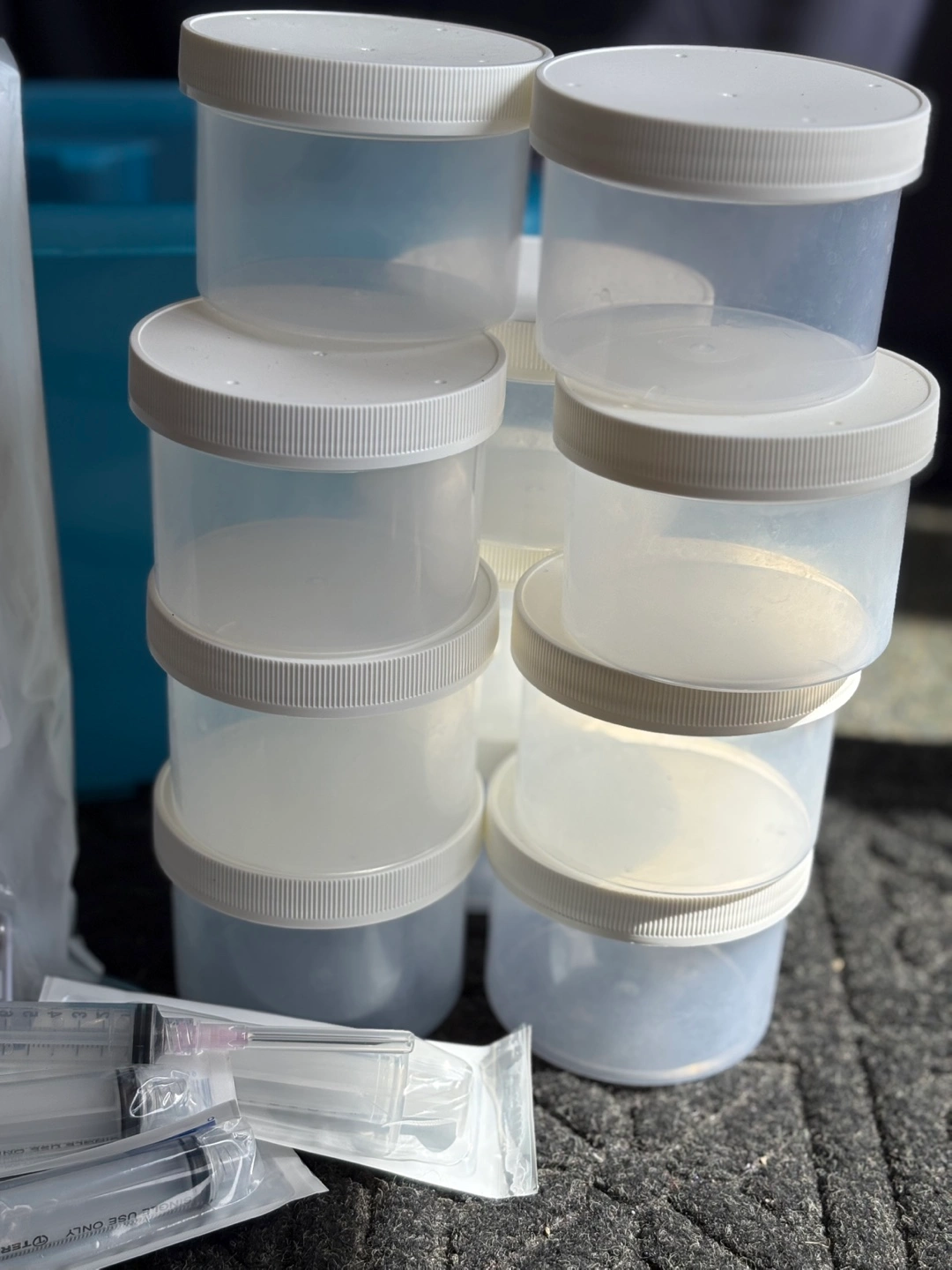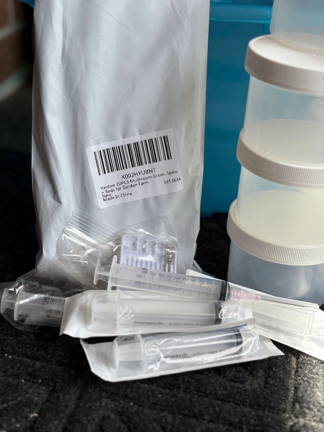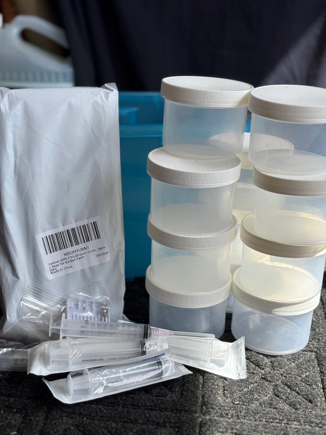 Eight small clear jars with white lids. Several syringes and replacement needles included. Mushroom growing bags.