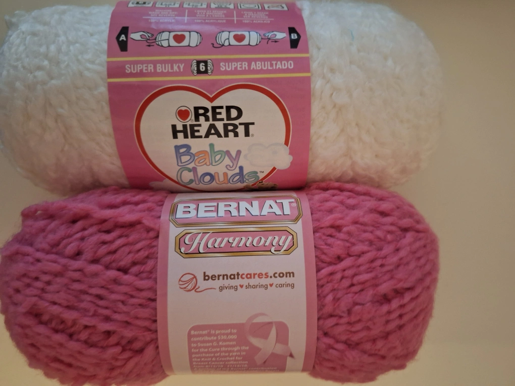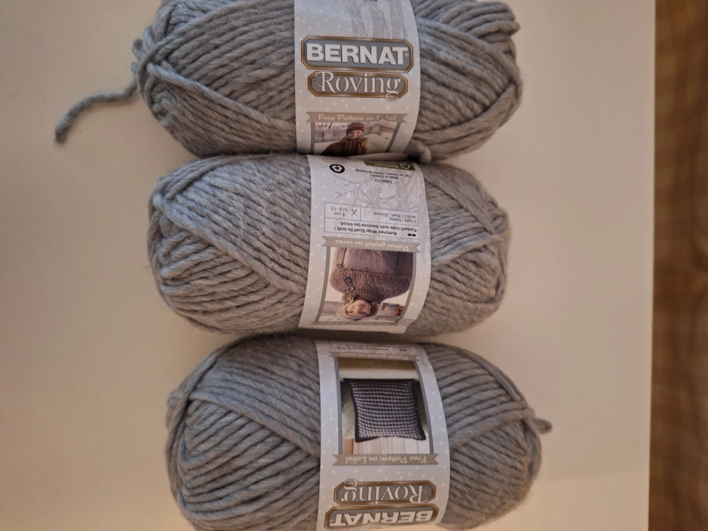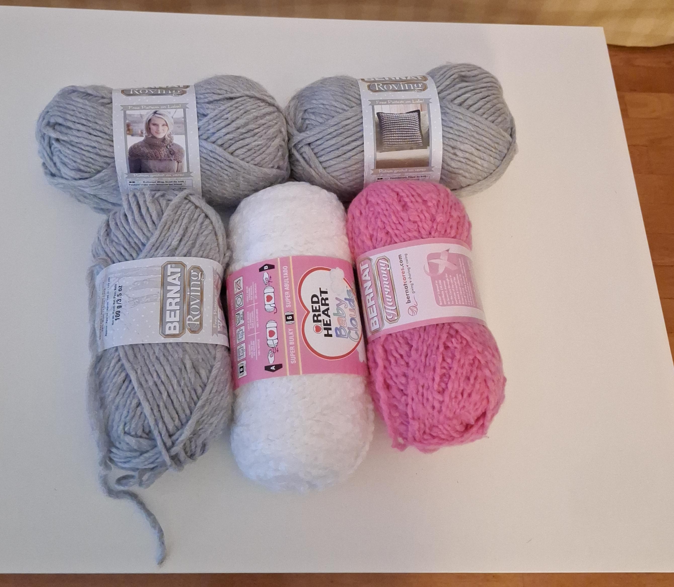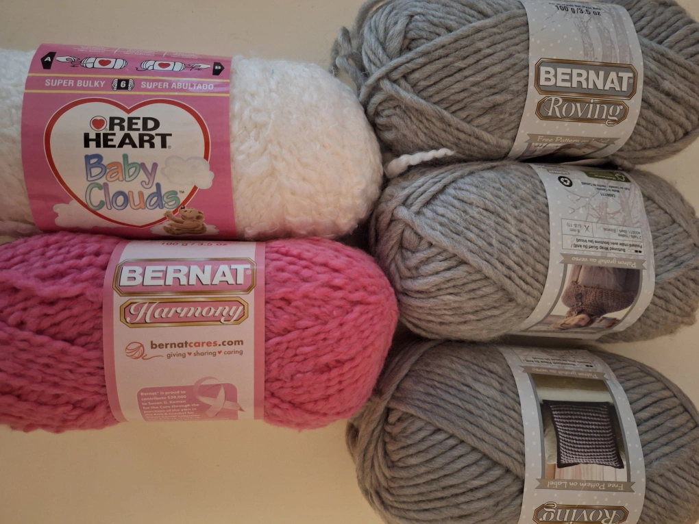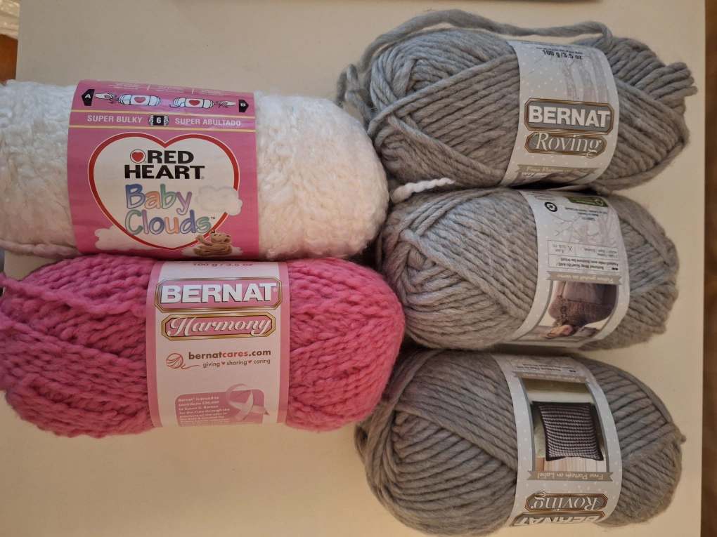 Selling a bundle of yarn that includes: - Three skeins of Bernat Roving yarn in a lovely grey colour - One skein of Bernat Harmony in pink - One skein of Red Heart Baby Clouds in white Perfect for your next knitting or crochet project!