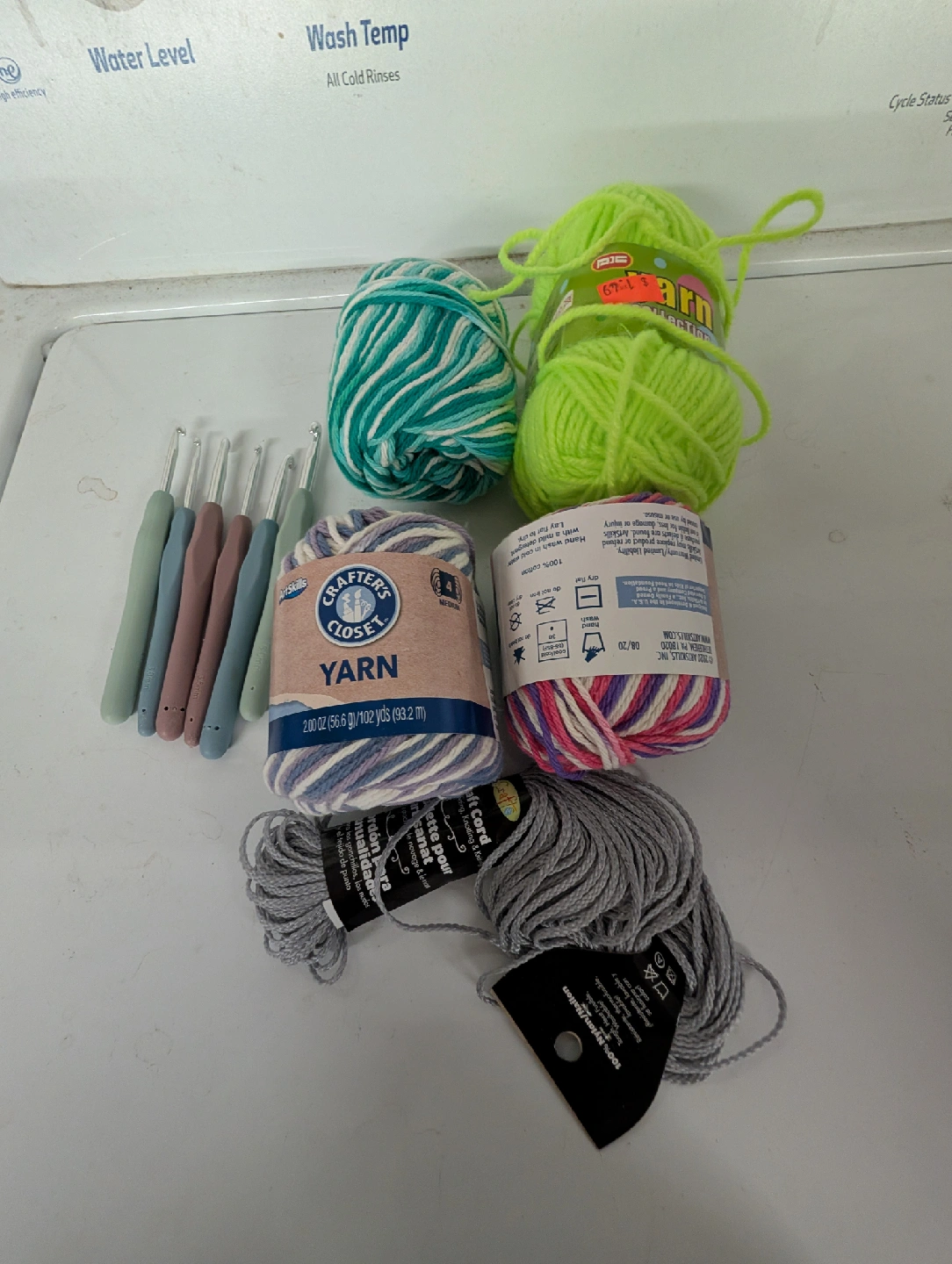 Selling a bundle of yarn and crochet hooks! There are multiple colours and types of yarn, including some from Crafter's Closet. The yarn is a mix of cotton and nylon. Perfect for your next crafting project