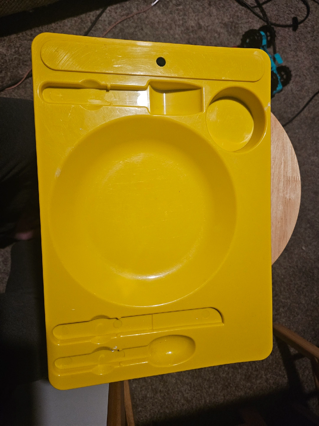 Selling a yellow,blue,and 2 green ones. adaptive dining plate. It's designed to help individuals with limited mobility or other challenges enjoy their meals more easily. It has compartments for utensils and a raised edge to prevent spills. don't have silverware anymore. It's in good condition and ready for a new home