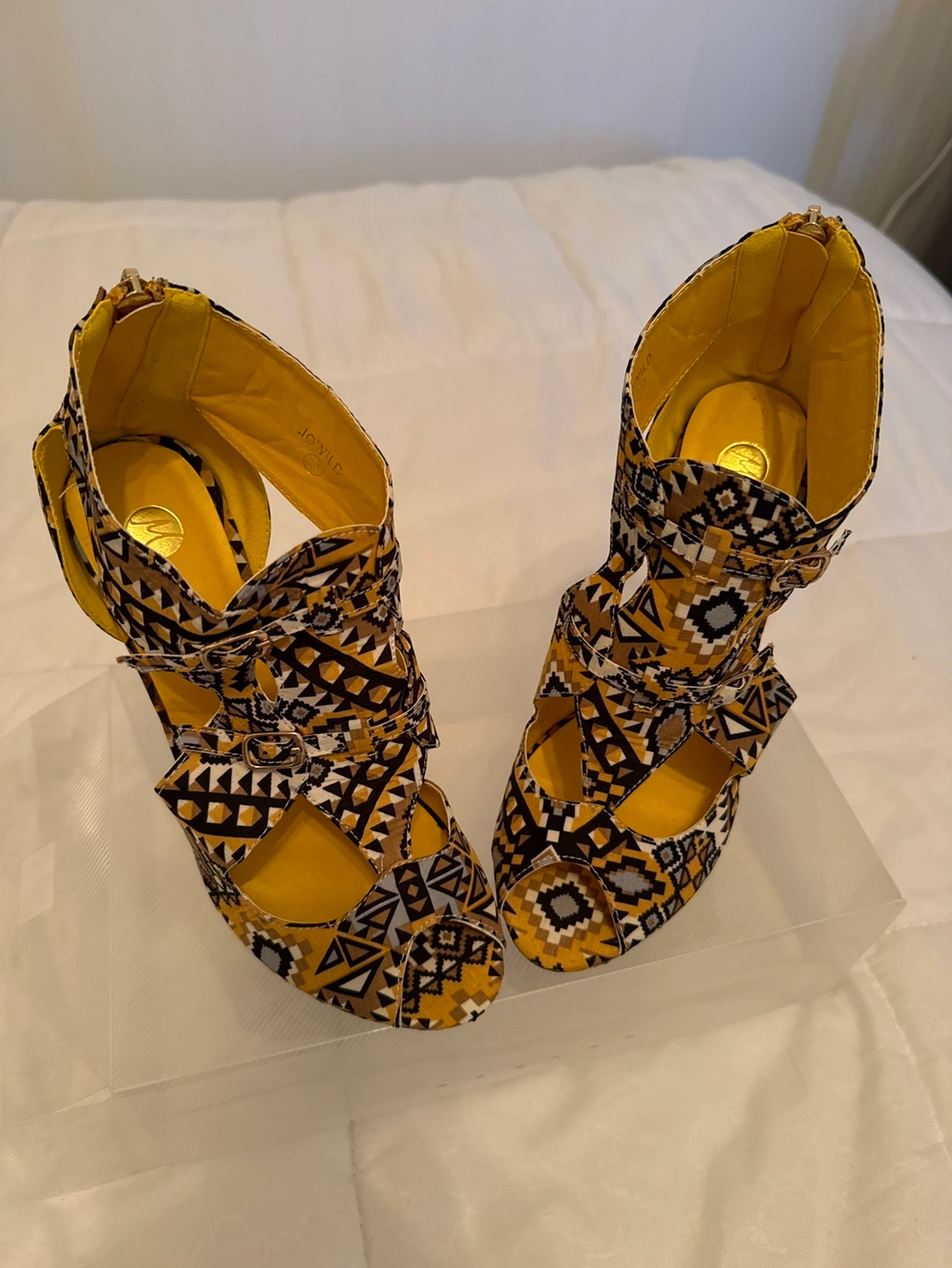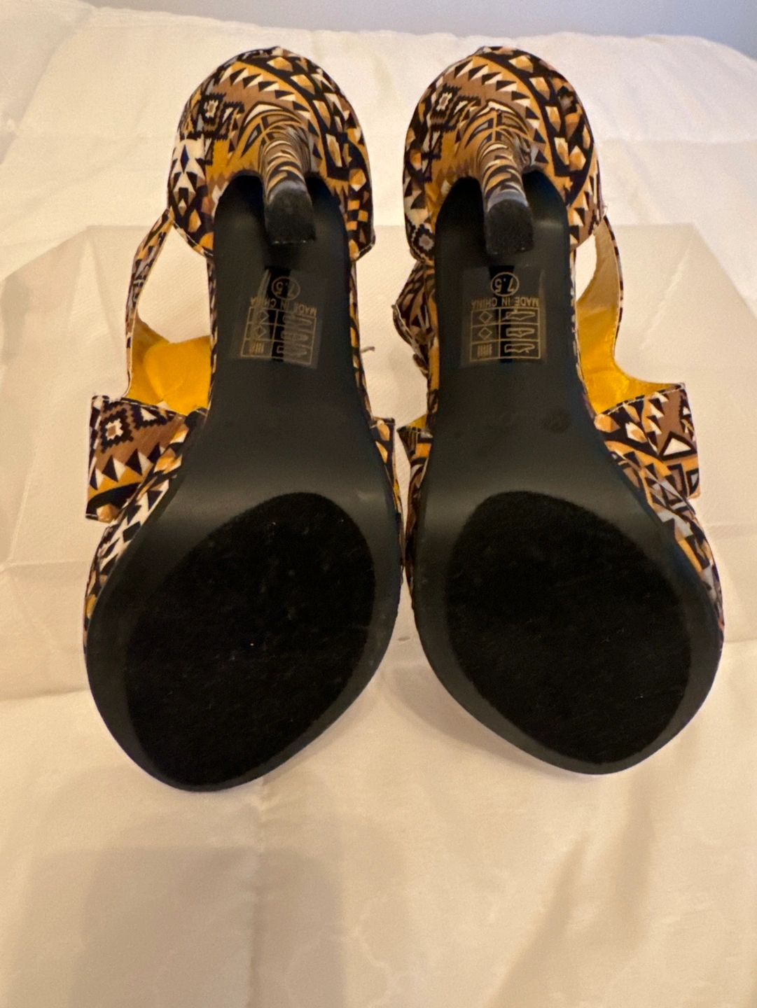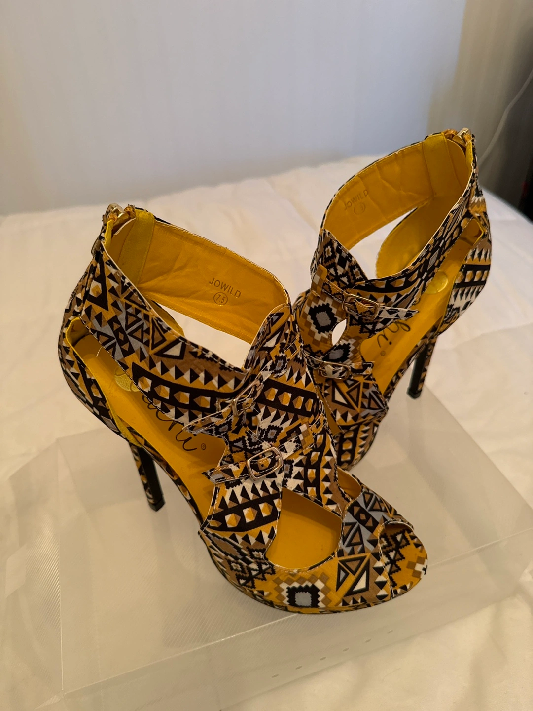 These are a beautiful pair of heels that are perfect for a night out. They have a yellow and black pattern and a high heel. Barely use as you can tell by the soles.