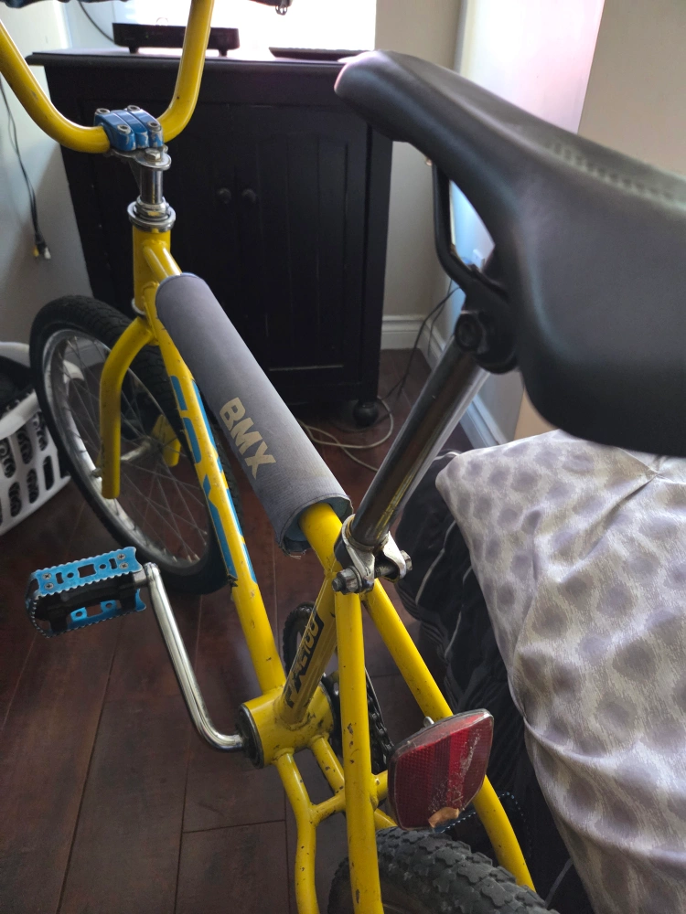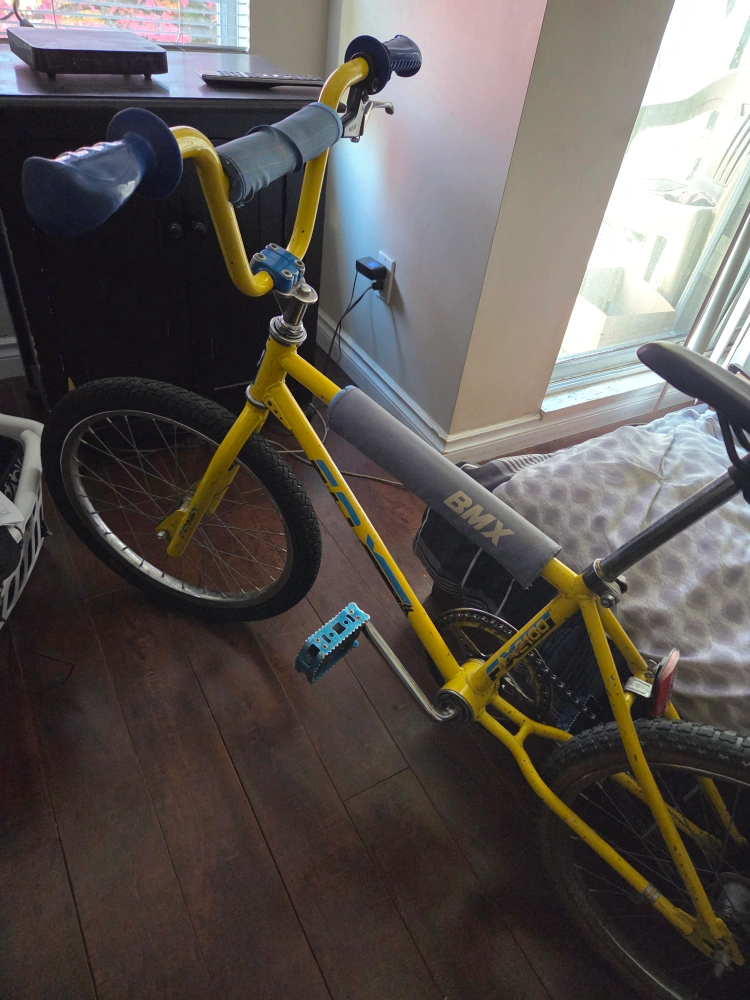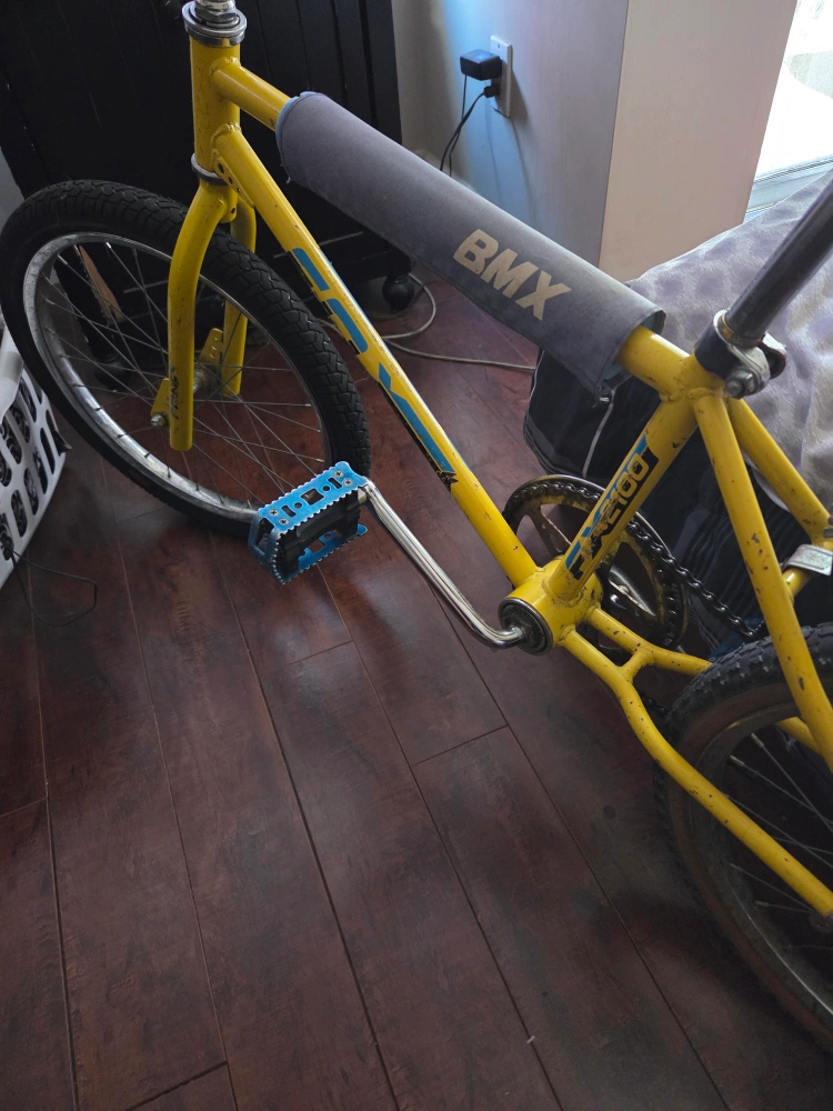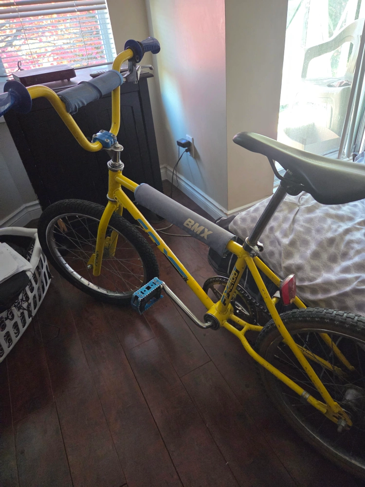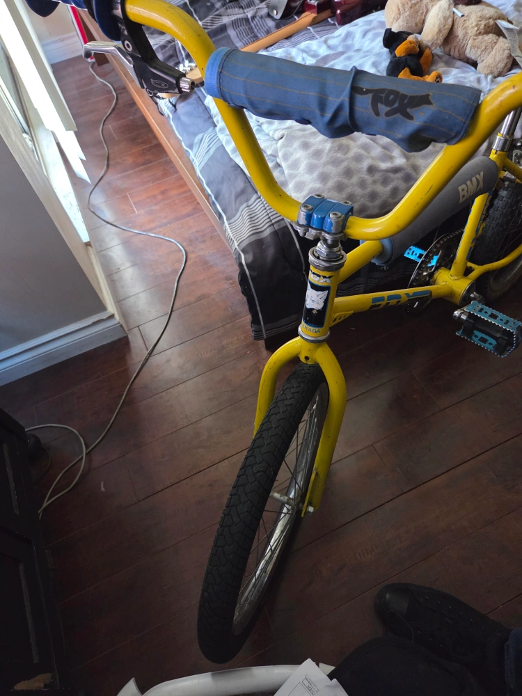 Selling a yellow original BMX FOX RACING bike. It has a original black seat, handlebar grips and the frame and bandle bar pad.Has classic back brake system, on 20" tires. 80$ OBO please text 236 512 5243
