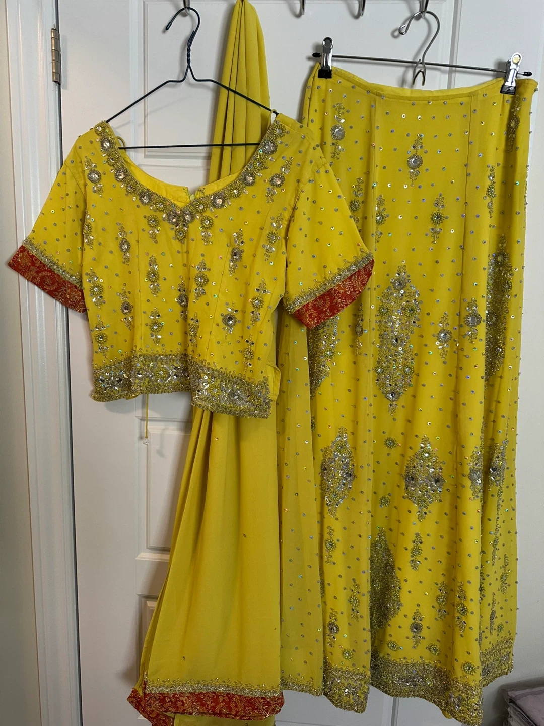 Gorgeous yellow lehenga choli set, perfect for a special occasion! The fabric is lightweight and comfortable. The set features beautiful embellishments and intricate detailing. Includes the skirt (lehenga), top (choli), and dupatta. Waist is 31 inches and length is 40inches for Lehnga. One of the back tie pearl is missing. My daughter wore it just once for few hrs.