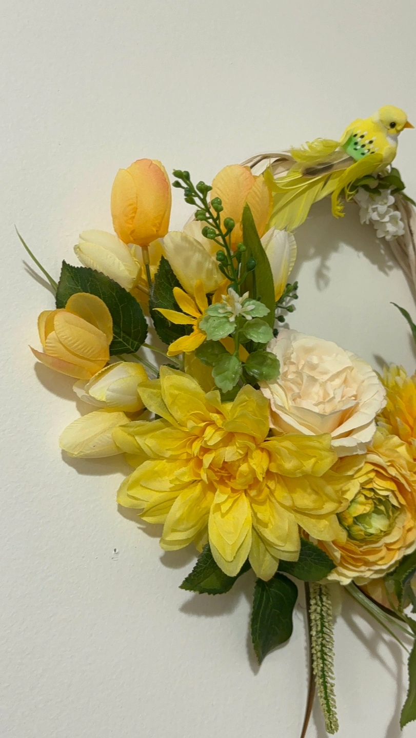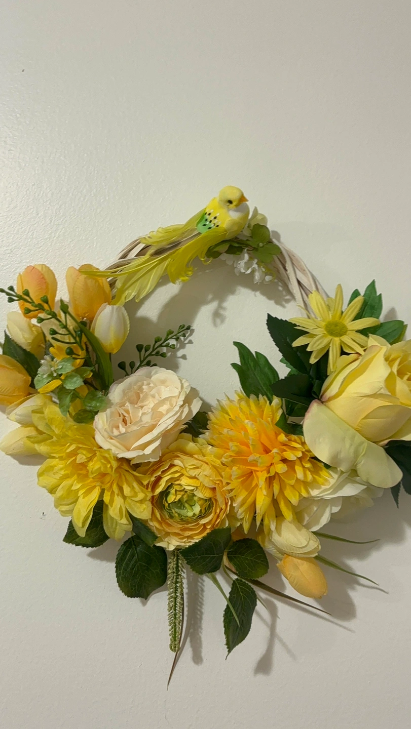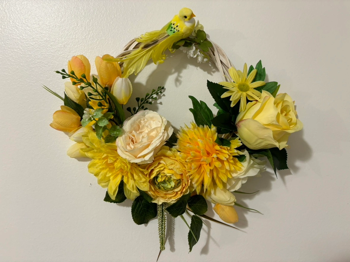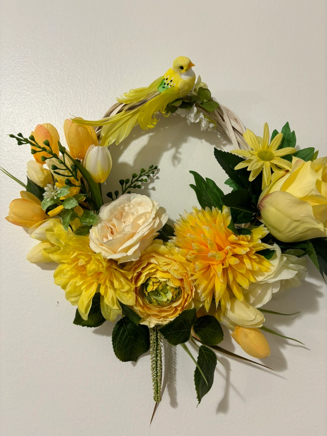 A beautiful yellow & white floral wreath with a bird perched on top. The wreath is made with artificial flowers and greenery. It would be a great addition to any home. 12” Pickup in Mississauga