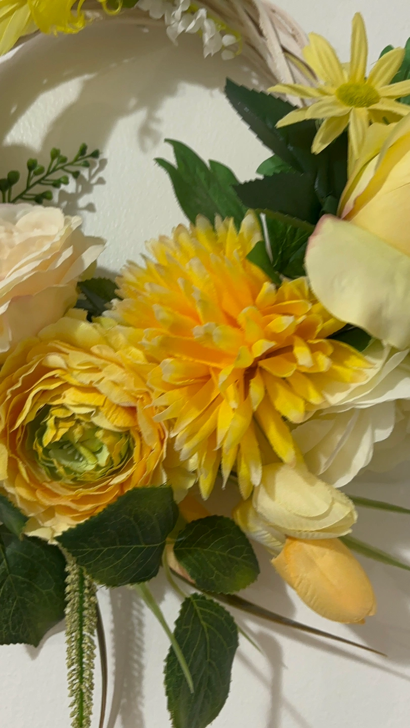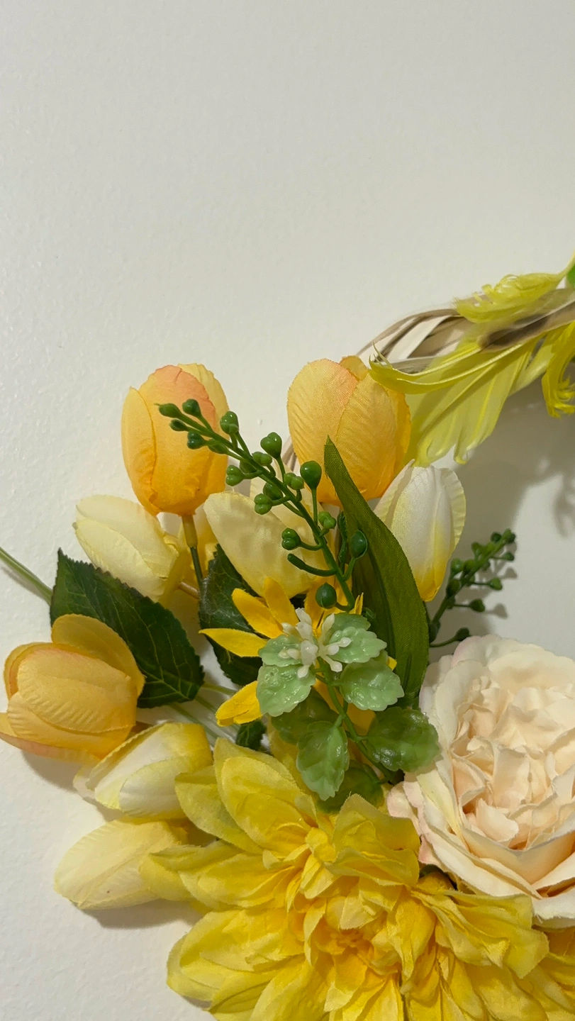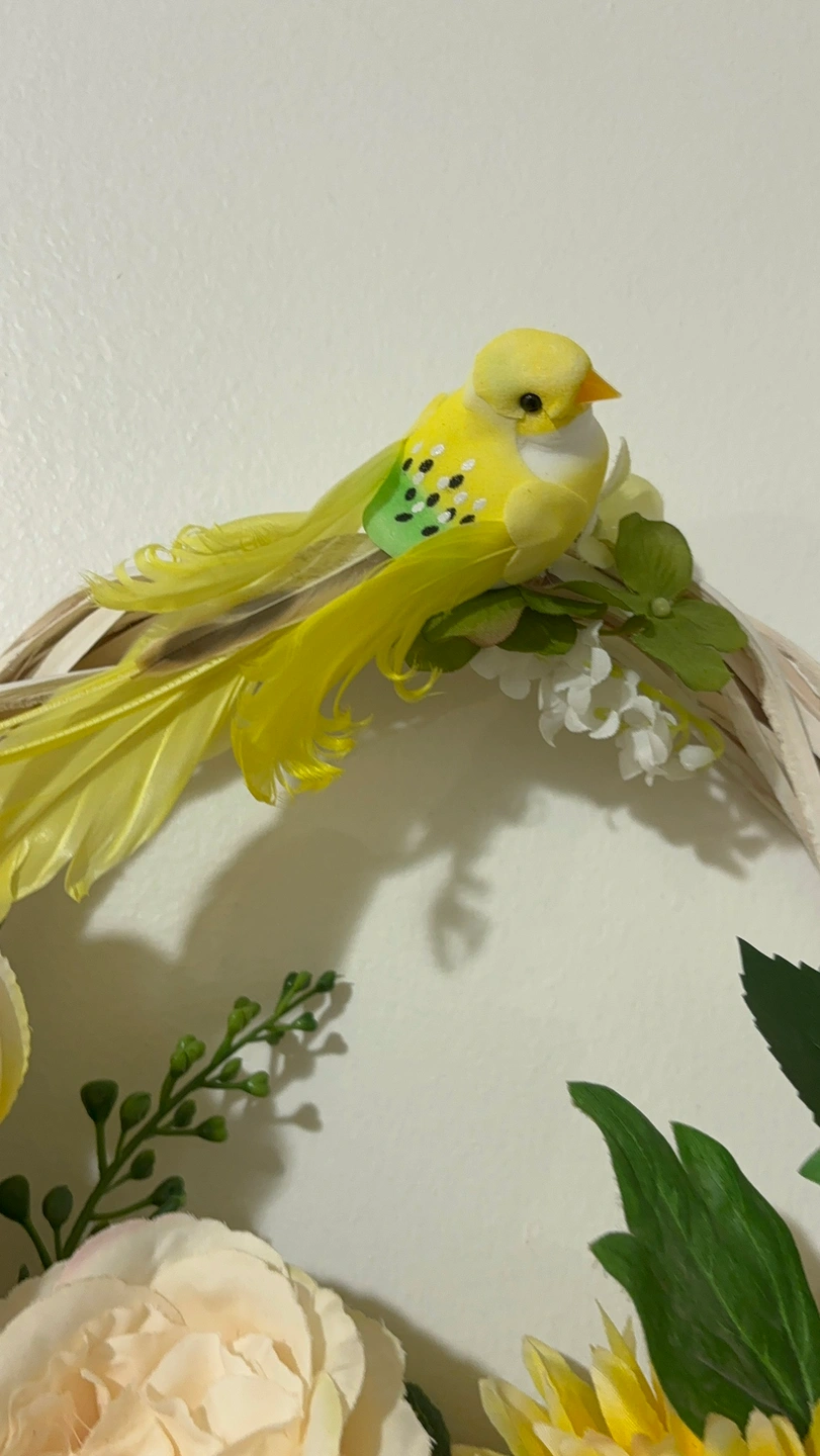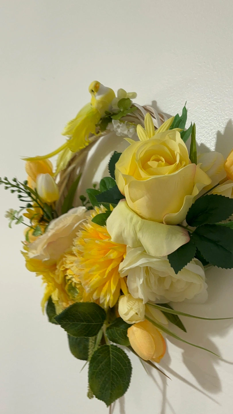 A beautiful yellow & white floral wreath with a bird perched on top. The wreath is made with artificial flowers and greenery. It would be a great addition to any home. 12” Pickup in Mississauga